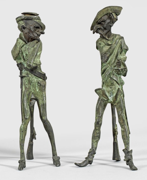 Gegenstücke. 1-flg.; Bronze, patiniert. Vollplastische Leuchter in Gestalt zweier grotesker, in den Proportionen überlängter, sich seitlich anschauender älterer Männer in Barock-Tracht mit Degen, sich rücks. auf Gewehr stützend, der Hut bzw. die Mütze als Tülle. H. 31 cm-32 cm.