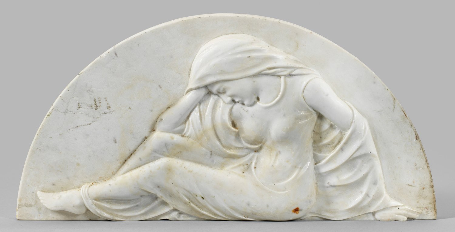 Weißer Marmor. Jugendstil-Relief in Segmentbogenform mit allegorischer Darstellung einer sitzenden, ihren Kopf mit der rechten Hand abstützenden, jungen Frau. Ger. best.; Oxidationsflecken. H. 22 cm; B. 45 cm.