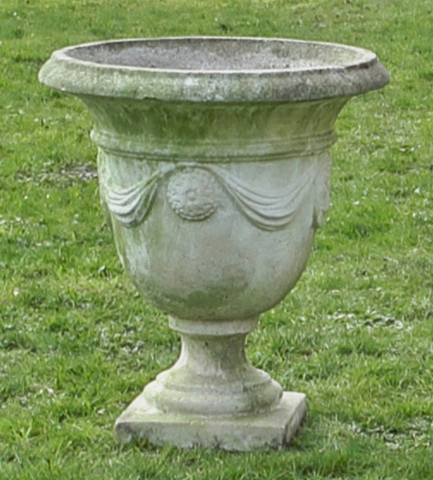 Gussstein. Über quadratischer Plinthe balusterförmiger Korpus mit umlaufendem Dekor aus Medaillons und Draperiewerk sowie weit ausschwingendem Lippenrand. Besch.; H. 66 cm.