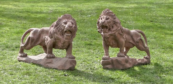 Gegenstücke. Roter, sandsteinfarbener Steinguss. Auf unregelmäßiger Plinthe stehende, vollplastische, majestätische Mähnenlöwen als Herrschaftssymbole in schreitender Pose, ihre Köpfe mit geöffnetem Maul nach rechts bzw. links wendend. H. 56 cm-62 cm.