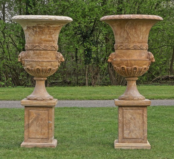 Caramelfarben gemaserter Marmor. Balusterförmiger Korpus mit weit ausladendem Lippenrand aus Reserven mit reliefiertem Akanthusblatt. Umlaufend der Wandung erhaben reliefierter, blattgefüllter Zungenfries sowie schmaler Fries aus Perlstab und geschwungener Blattranke. Seitlich plastisch gestaltete Löwenmaskarons. Unterhalb hohe gekantete Postamente, allseitig mit kassettierten Füllungen auf quadratischem Profilsockel. Minim. besch.; Ges.-H. 195 cm.