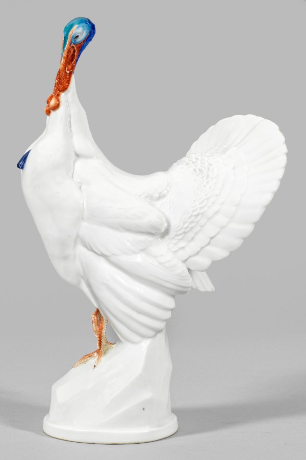 Auf einem geometrisch geformten Gesteinssockel die vollplastische Darstellung eines sitzenden Truthahns. Dezente polychrome Malerei. Entw. Paul Walther, um 1918. Entw.-Bez. "PW" mit Dat. "1918". Modell-Nr. F 279. Produktionsbed. Spannungsrisse. Schwertermarke. H. 37,5 cm.