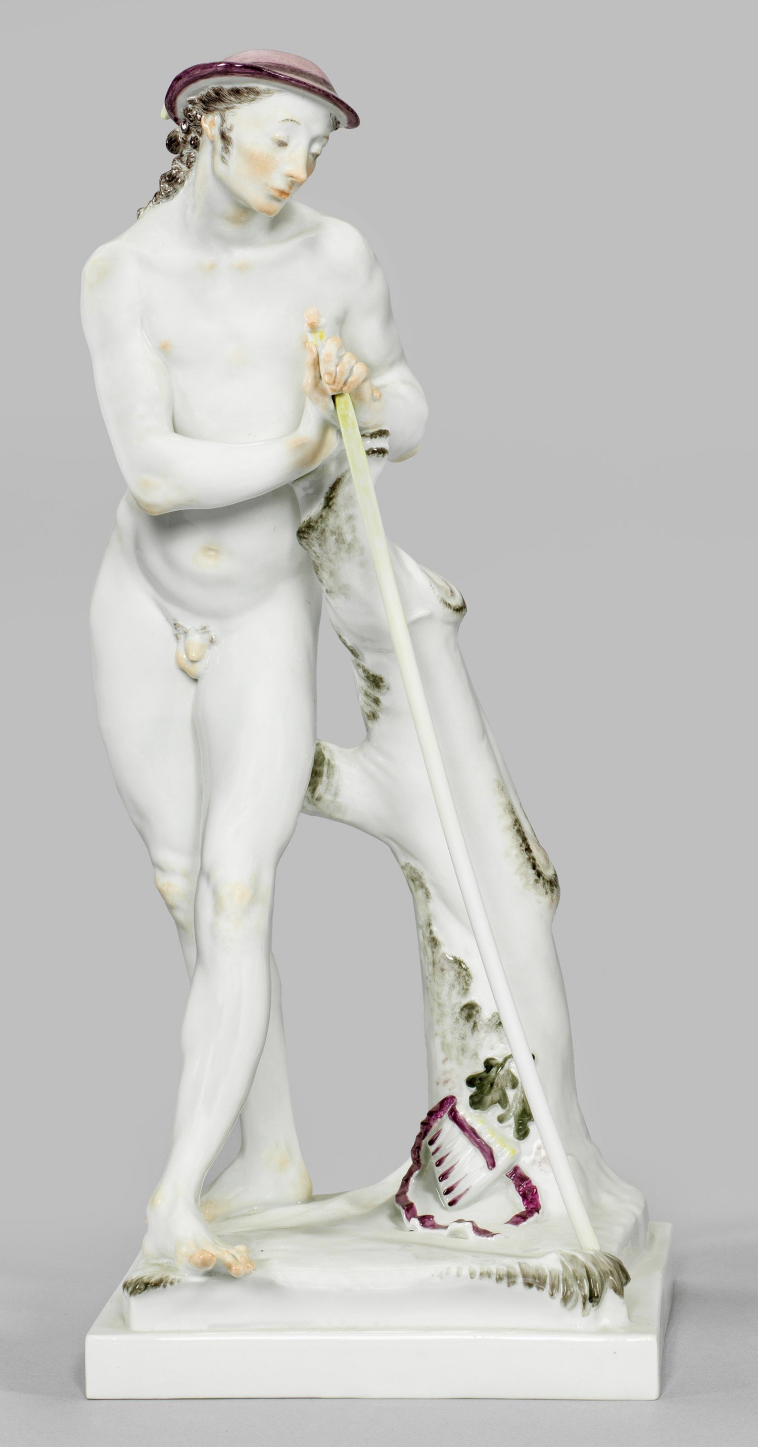Auf Rechteckssockel an einem Eichenstamm mit dort abgelegter Panflöte stehender Jüngling als Hirte mit ausdrucksstarken Gesichtszügen, sich mit der linken Hand auf den langen Hirtenstock stützend. Sparsame polychrome Malerei. Entw. Paul Scheurich, um 1920. Modell-Nr. 73313. Entw.-Bez. mit Dat.; Schwertermarke. H. 35 cm.