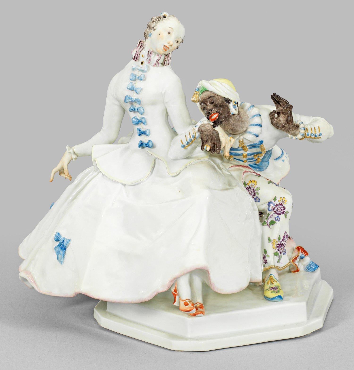 Auf sechseckigem Sockel sitzende Rokoko-Dame. Seitlich kniender Mohr, ihr einen Handkuss gebend. Sparsame, teilw. goldgehöhte, polychrome Aufglasurmalerei. Entw. Paul Scheurich, 1917. Modell-Nr. 73316. Entw.-Bez.; Schwertermarke. H. 28 cm.