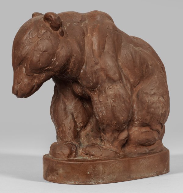 Böttgersteinzeug. Auf einem Ovalsockel die vollplastische Darstellung eines sitzenden, leicht nach vorne geneigten jungen Bären. Entw. Prof. August Gaul, 1926. Entw.-Bez.; Modell-Nr. A 1132. Produktionsbed. Spannungsriss; minim. best.; Schwertermarke. H. 31 cm.
