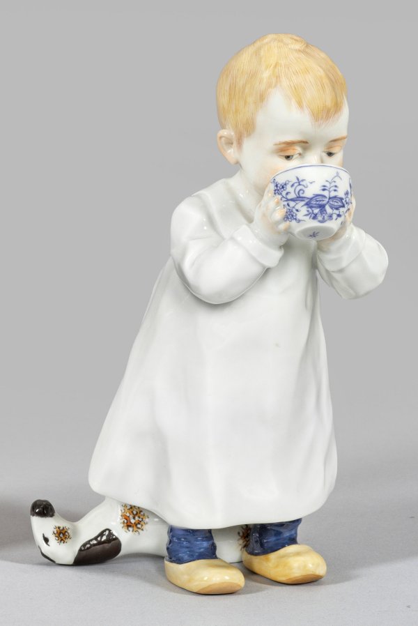 Stehendes Kind mit weißem Kleid, aus einer Zwiebelmustertasse trinkend. Hinter ihm ein auf dem Rücken liegendes Spielpferd. Naturalistische Ausformung. Polychrome Aufglasurmalerei. Entw. Konrad Hentschel, 1905. Modell-Nr. 73364. Schwertermarke. H. 17 cm.