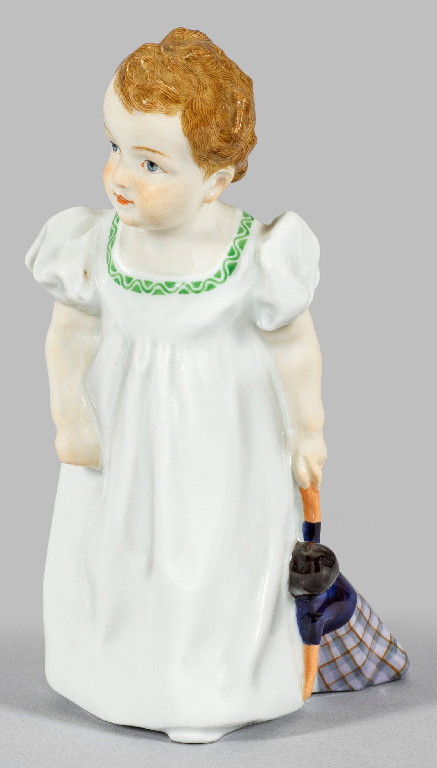 Stehendes, kleines Mädchen in langem, weißem Kleid, mit der linken Hand ihre Puppe hinter sich herziehend. Polychrome Aufglasurmalerei. Entw. Konrad Hentschel, 1907. Modell-Nr. X 164. Schwertermarke. H. 17 cm.