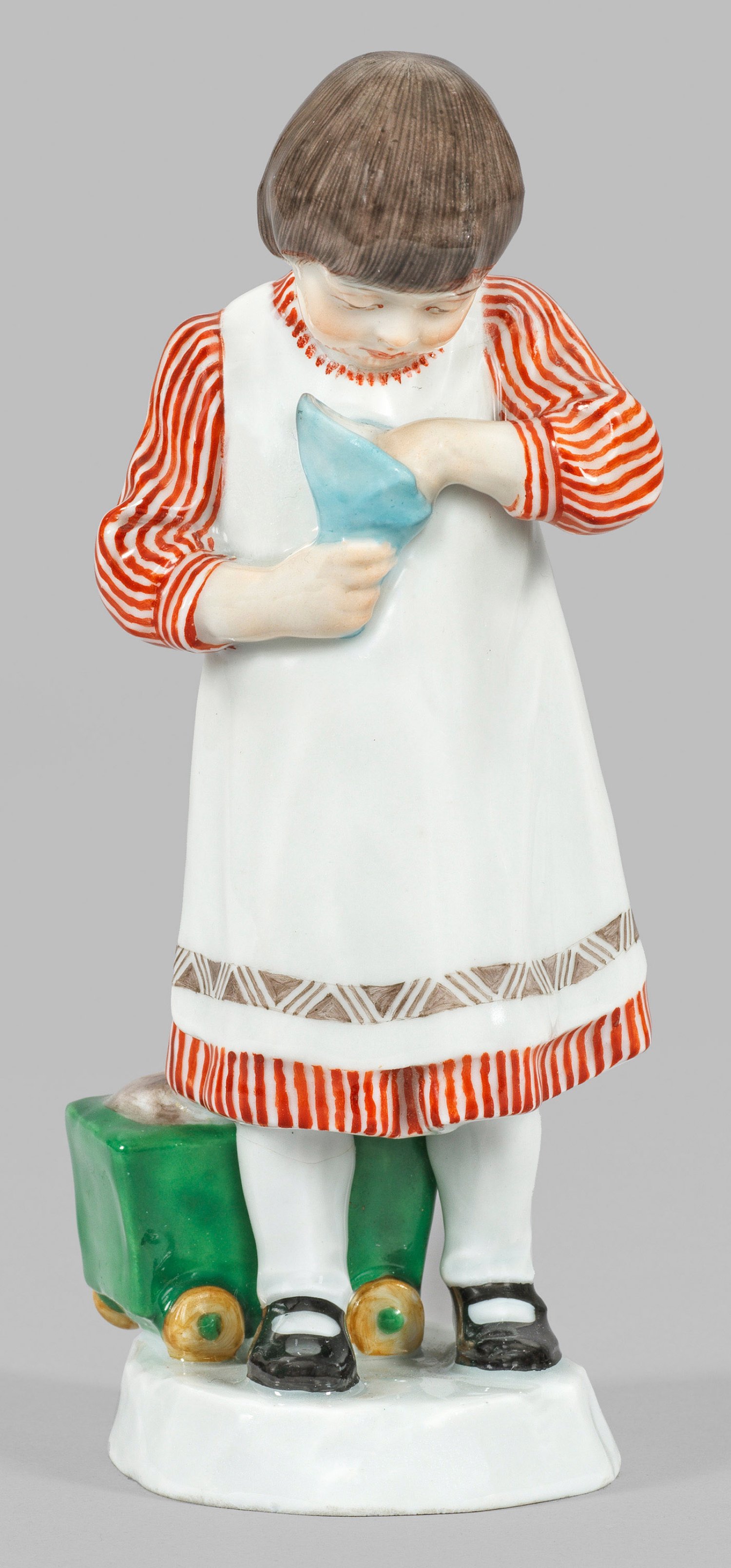 Auf rundem Sockel stehendes, dunkelhaariges Mädchen in weißem, rot gestreiftem Kleid und weißer Schürze mit Ornamentbordüre. Polychrome Malerei. Entw. Paul Helmig, um 1908. Modell-Nr. Y 180. Rest.; Schwertermarke. H. 14,5 cm.