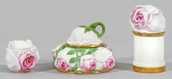 3-tlg.; Puderdose und zwei Dosen. Deckelknäufe und Griffe teilw. als plastischer Zweig gestaltet. Feinrankiger Rosendekor mit großen Blüten und Knospen. Polychrome Aufglasurmalerei in Rosa- und Grüntönen. Goldrand. Form und Dekor Entw. Heinrich Vogeler, Worpswede, 1905. Modell-Nr. U 190, U 193 und U 195. Teilw. minim. best./rest.; Schwertermarke. H. bis 12,5 cm. D. bis 12,5 cm.