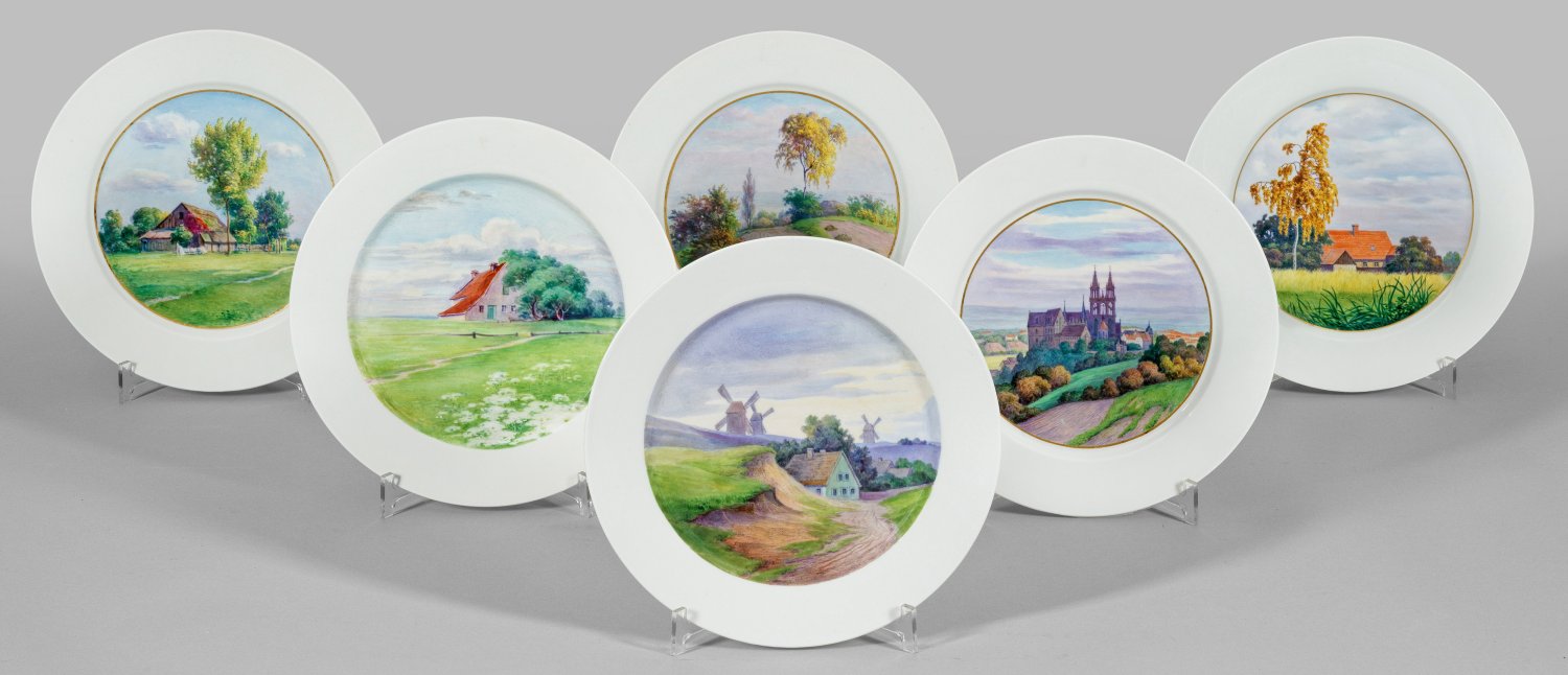 Im leicht vertieften, teilw. goldgerahmten Spiegelmedaillon sommerliche Landschaften, teilw. mit Gehöften sowie der Ansicht des Meissener Doms, in feiner polychromer Malerei. Modell "T glatt". Form-Entw. Gebrüder Hentschel und Werkstatt. Dekor-Entw. und Ausführung wohl Arthur Barth (1878 - 1926), seit 1906 als Figuren- und Landschaftsmaler tätig. Teilw. unw. ber.; Schwertermarke. D. 27 cm.