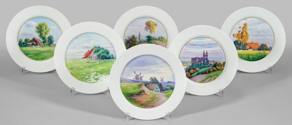 Lot 140: Satz von sechs Jugendstil-Tellern mit Landschaftsmotiven