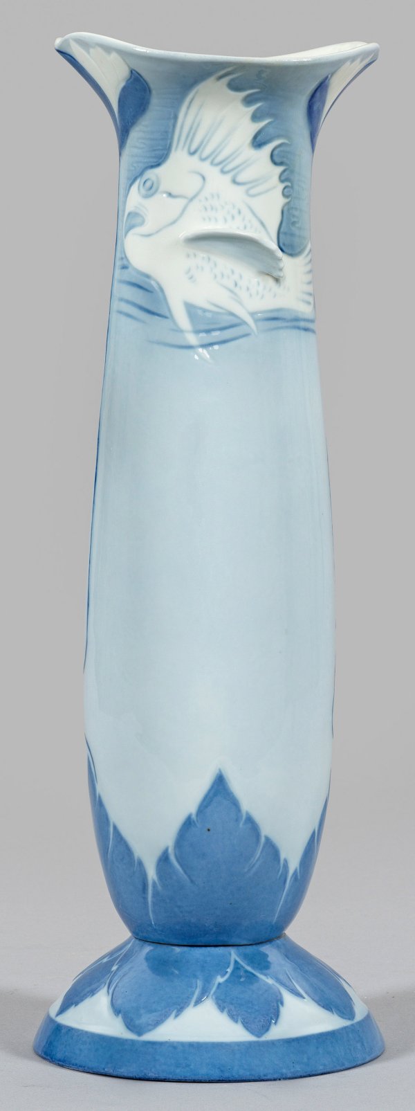 Gewölbter Rundfuß, darauf montierter schlanker balusterförmiger Korpus mit leicht ausschwingendem, blütenförmigen Rand. Floraler, teilw. reliefierter Dekor mit zwei korrespondierenden Drachenfischen und deren plastisch gearbeiteten Flossen. Unterglasublaue Malerei. Entw. Theo Schmuz-Baudiss, um 1900. Künstler-Monogr.; Manufakturmarke. H. 42,5 cm.