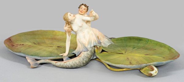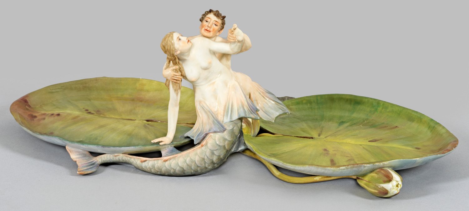Zentral von zwei naturalistischen, schalenfömig korrespondierenden Seerosenblättern mit ihren knospenden Blüten eingefasste Darstellung einer Nixe, die von einem Triton überrascht und gefangen wird. Reliefierte Schwanzflossen. Fein nuancierte polychrome Malerei. Entw. Richter, 1898. Modell-Nr. R 119. Rest.; Schwertermarke. H. 15 cm. L. 45 cm.