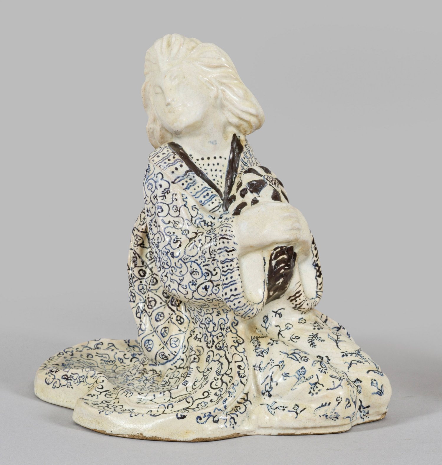 Keramik. Vollplastische, stilisierte Figur einer jungen Japanerin bzw. Geisha. Weißgrauer Scherben und korrespondierende, fein craquelierte Glasur. Dunkelblauschwarze Bemalung. Pressmarke der Keramischen Fachschule Landshut mit Nr. 30 sowie undeutl. handschriftliche Bezeichnungen in Bleistift. H. 21,5 cm.