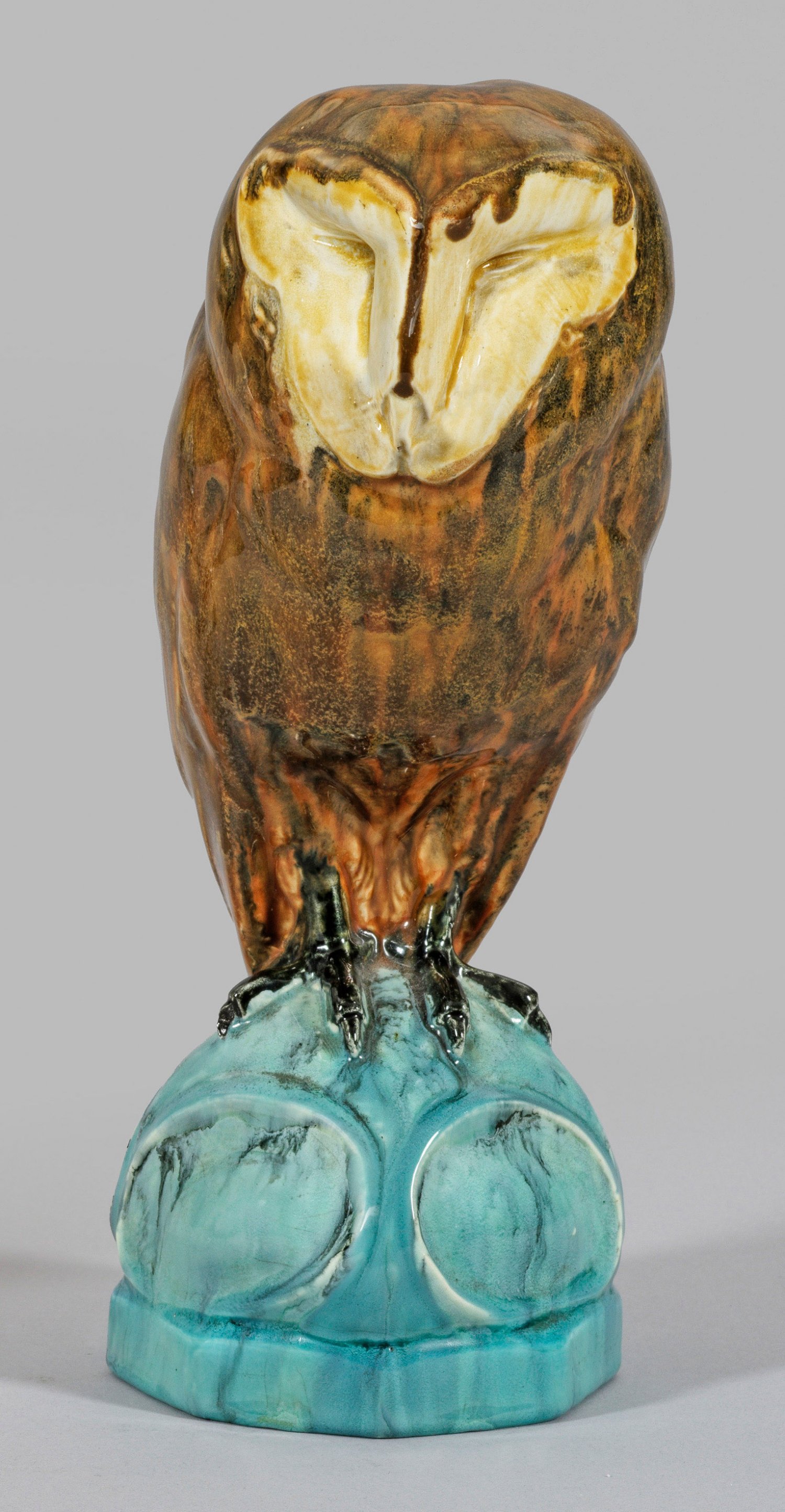 Keramik, polychrom glasiert und bemalt. Auf einem stilisierten, achteckigen, oberhalb halbkugeligen, reliefierten Sockel sitzende, vollplastische Eule. Werkstatt-Pressmarke mit Krug im Achteck, undeutl. Stempel mit Namens-Bez. u. Ortsangabe München in Rot. H. 28 cm.