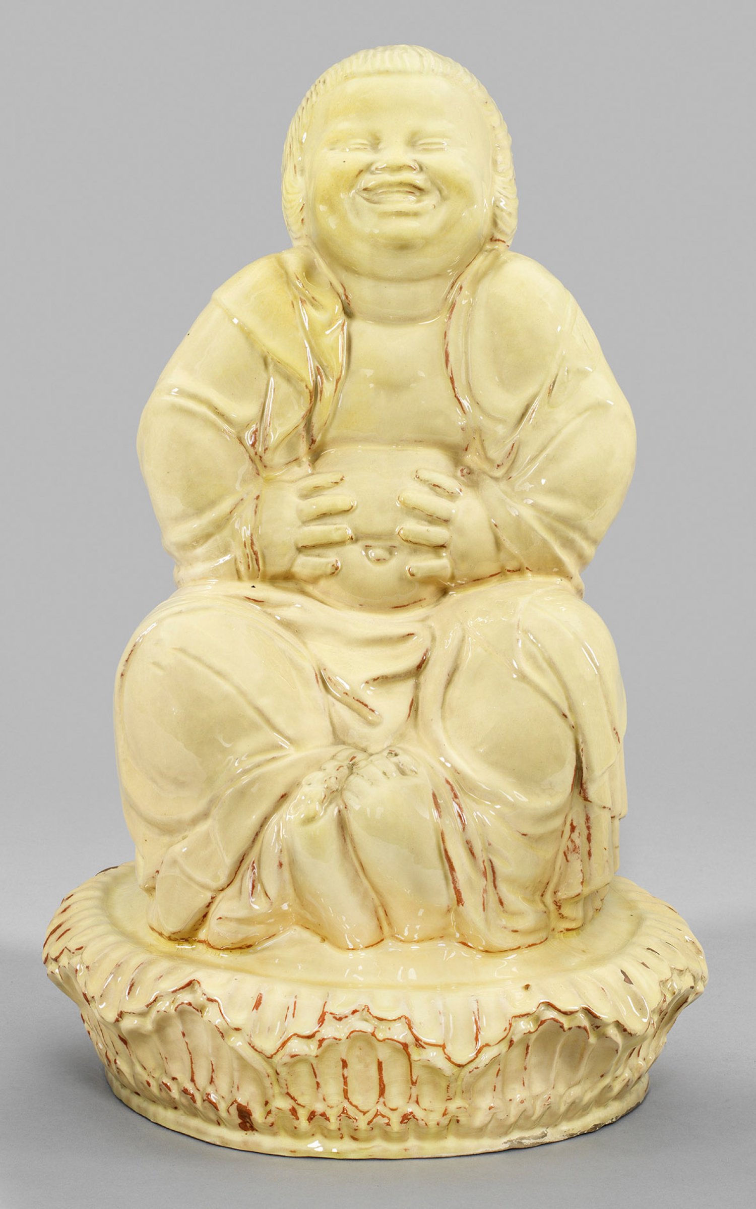 Irdenware, gegossen oder ausgeformt, roter Scherben, gelblich sandfarben engobiert, farblose, transparente Glasur. Entw. 1912. Sign. u. dat. "B. Hoetger 1912" sowie betitelt "Licht". Die Figur zeigt einen beleibten, buddhistischen Mönch bzw. Buddha, der auf einem Sockel sitzend wiedergegeben ist und eine überschäumende Heiterkeit ausdrückt. Offensichtlich wurde Hoetger hierzu von einer Glücksgott-Figur des halblegendären Mönchs Budai aus Ostasien inspiriert. Hoetger schuf diese Plastik als Teil des insgesamt 15-tlg. bedeutenden Figurenzyklus der "Licht- und Schattenseiten" (1911/12). Zeitnah realisierte Max Laeuger die Entwürfe Hoetgers schon 1912 in der von ihm geleiteten Kunstkeramischen Abteilung der Tonwerke Kandern. 1914 inszenierte Hoetger das komplette Ensemble während der letzten Ausstellung der Künstlerkolonie in Darmstadt in konzeptueller Gegenüberstellung in einem Raum. Glasur minim. best.; Firmenmarke "KTK". H. 47,5 cm.