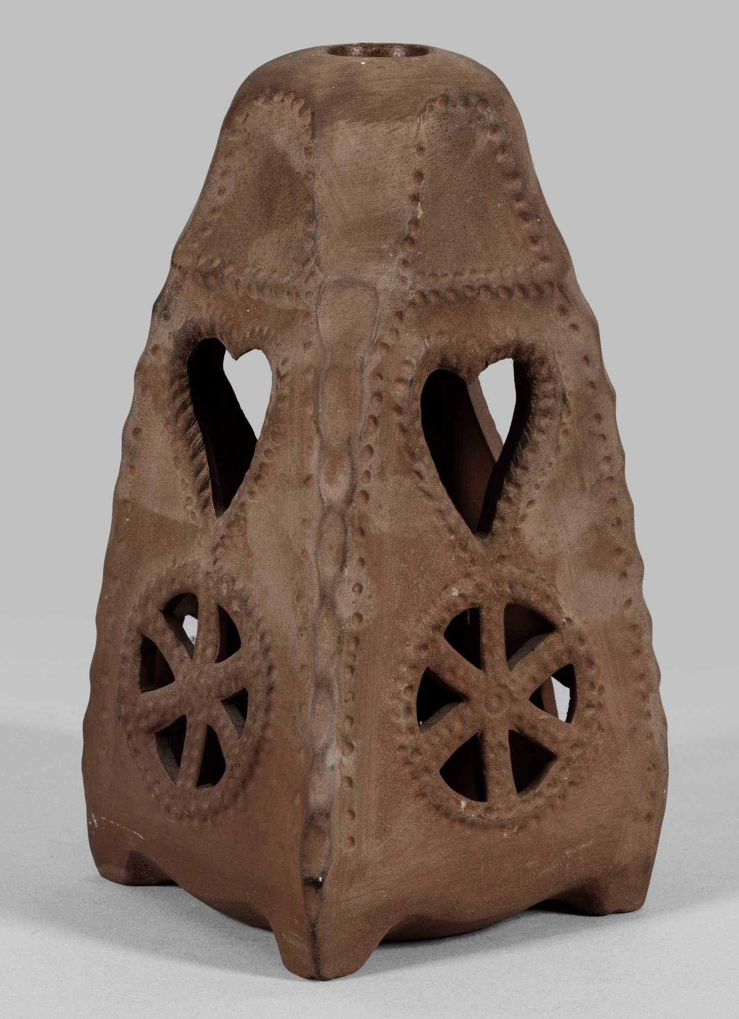 Keramik. Braun glasierter Scherben. Hohler, zylindrisch sich nach oben verjüngender Korpus mit obig runder Vertiefung. Durchbrochen gearbeiteter, teilw. reliefierter Korpus mit Herzen und Runen. Manufakturmarke. H. 22 cm.