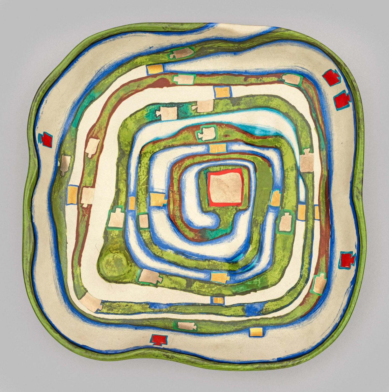 Ceramic bowl designed by Friedensreich Hundertwasser for Rosenthal, manufactured in a limited edition out of 2000. Inscribed, titled, dated 1983 and numbered 270/2000 with manufacturer‘s mark.