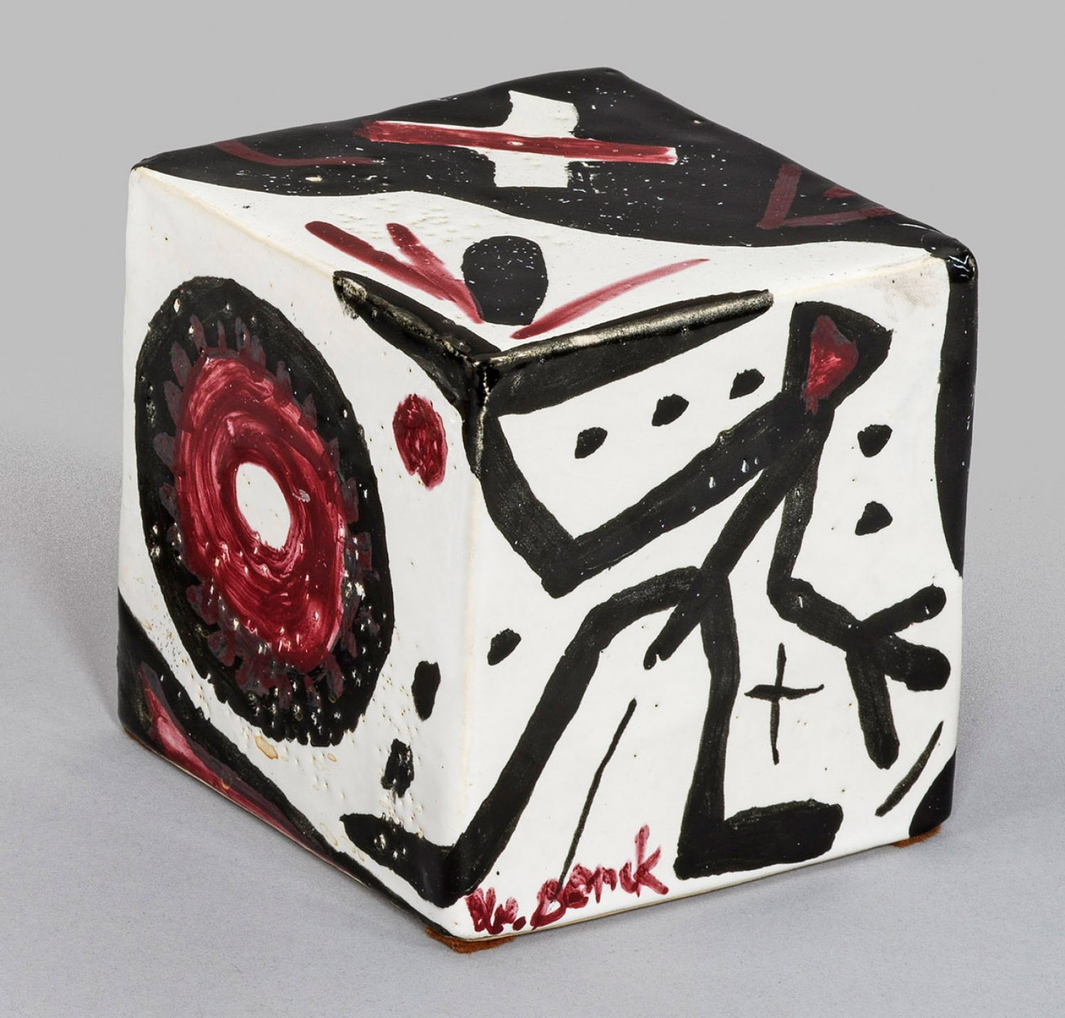 An unique black and red painted faience cube by A. R. Penck. Signed.