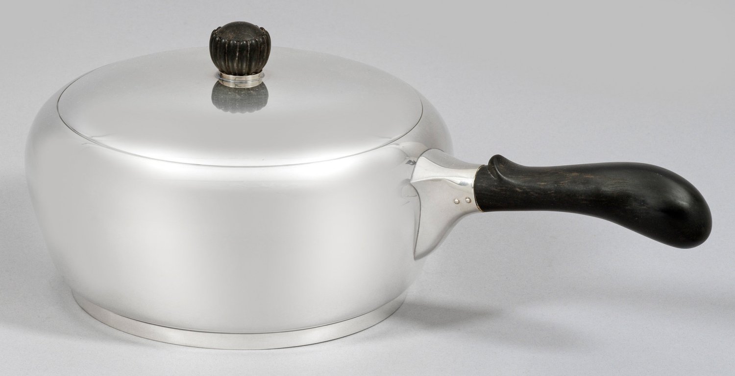 Sterlingsilber. Zylindrischer, schmaler Standring, übergehend in puristisch glatten, sich gering zum Rand hin konisch erweiternden Korpus mit nach innen gebogtem, gerundetem Rand. Runder Steckdeckel mit godroniertem Kugelknauf. Seitlicher Stielgriff aus ebonisiertem Holz. Gest. Sterling, Herstellerzeichen, Modell-Nr. 1912. Gew. ca. 750 g. H. 11 cm. D. 16,5 cm. B. mit Griff: 28 cm.