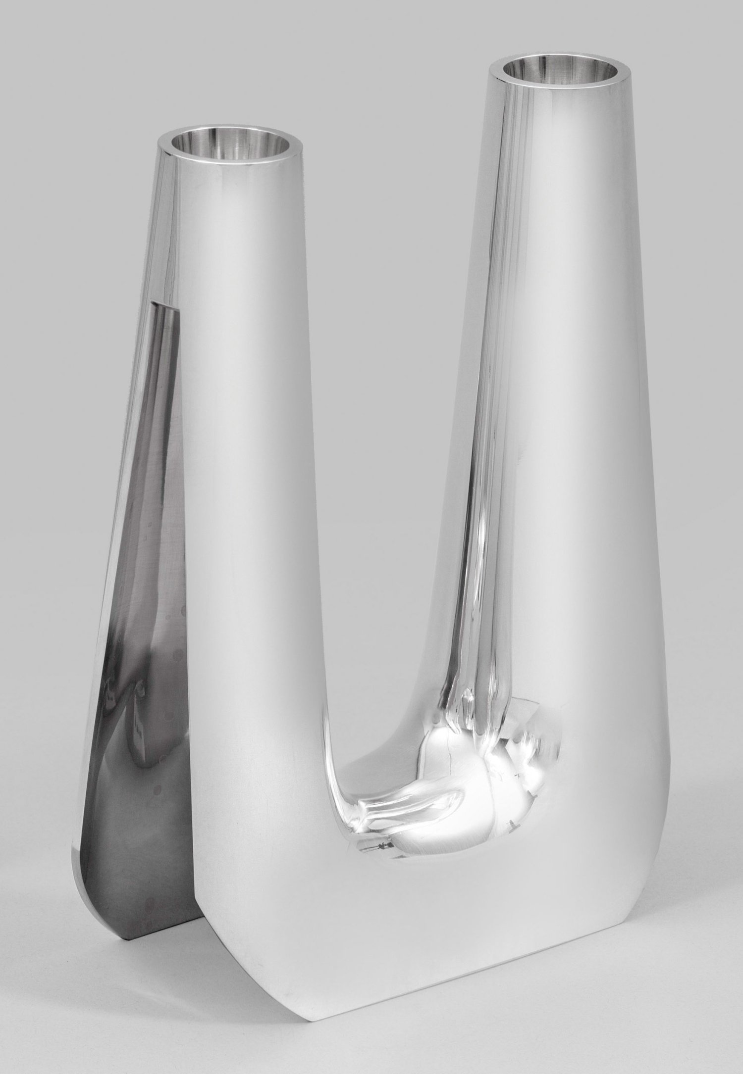 Sterlingsilber. 2-flg.; Konischer Schaft, U-förmig gebogt und fließend ineinander übergehend. Die Außenseite ausgehöhlt gearbeitet mit kufenähnlichem Stand. Entw. Sören Georg Jensen, 1960. Modell-Nr. 1087, C10. Gest. 925 sowie "Denmark Sterling", Entwerfer-Monogramm "Dessin SGJ", Herstellerzeichen. Gew. ca. 835 g. H. 17,7 cm.