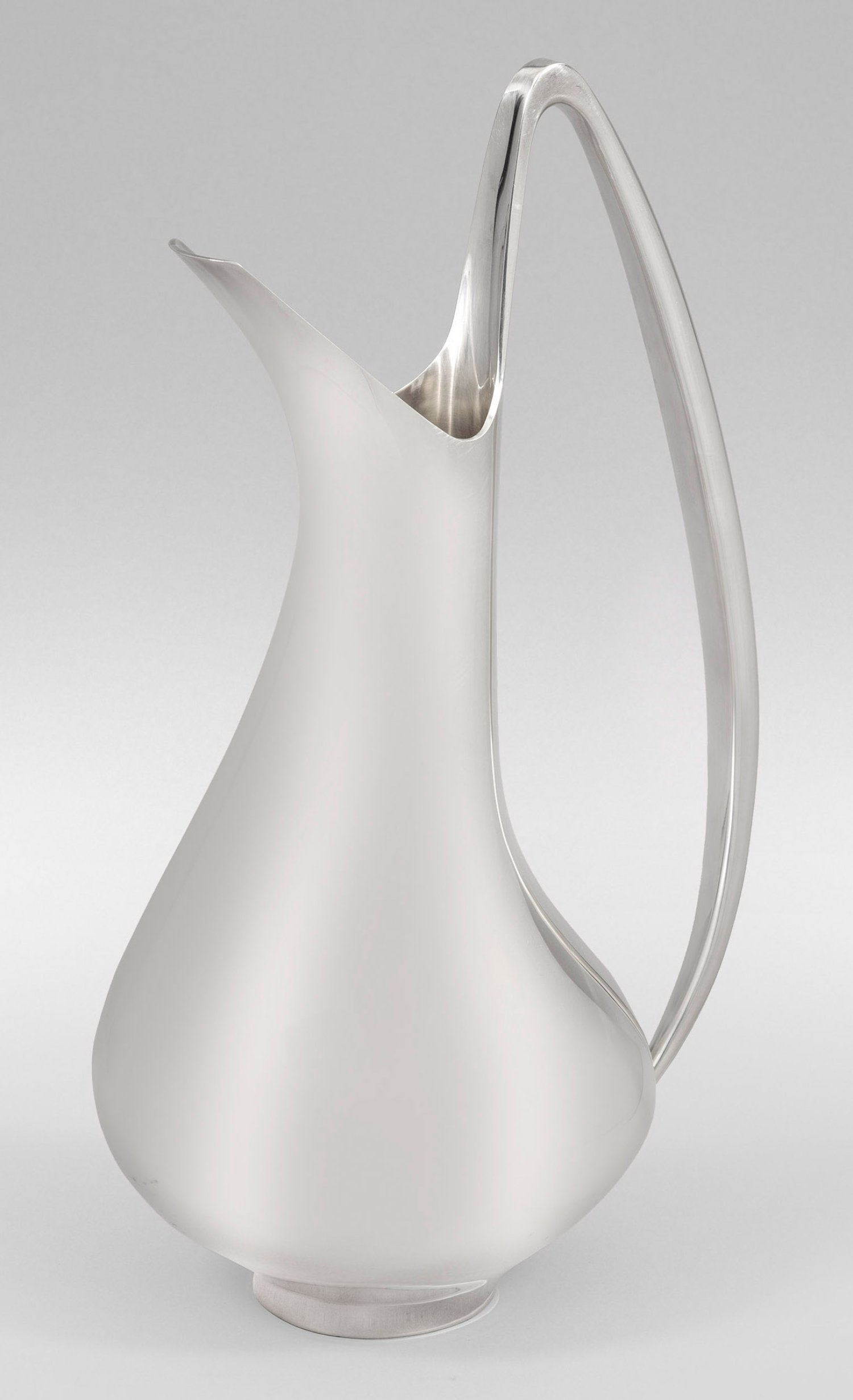 Sterlingsilber. Ovoider, flacher, gering eingezogener Stand, übergehend in rundlich gebauchte, hohe, organische Form. Verjüngter, leicht gebogter Hals in einem kantigen und konischen Ausguss endend. Glatte, schlicht elegante Wandung. Seitlicher, aus dem Korpus erwachsender und diesen bogenförmig umschließender Henkel. Entw. Henning Koppel, 1956. Modell-Nr. 1052. Gest. 925 sowie "Denmark Sterling", Beschauzeichen, Entwerfer-Monogramm "HK", Herstellerzeichen. Gew. ca. 2060 g. H. 42 cm