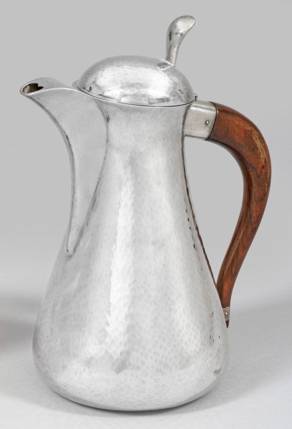 Sterlingsilber. Flacher, runder Stand, übergehend in gedrückt birnförmigen Korpus mit gerundetem, aufgewölbtem Scharnierdeckel und aufgestelltem Drücker. Die Wandung flächendeckend mit feinem Hammerschlagdekor verziert. Mittig angesetzter Konsolausguss mit herzförmiger Tülle. Gebogter, konischer Holzgriff. Gest. 925, Herstellerzeichen. Gew. ca. 965 g. H. 27,5 cm.
