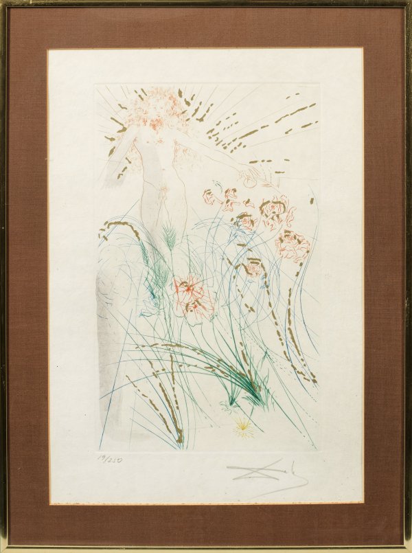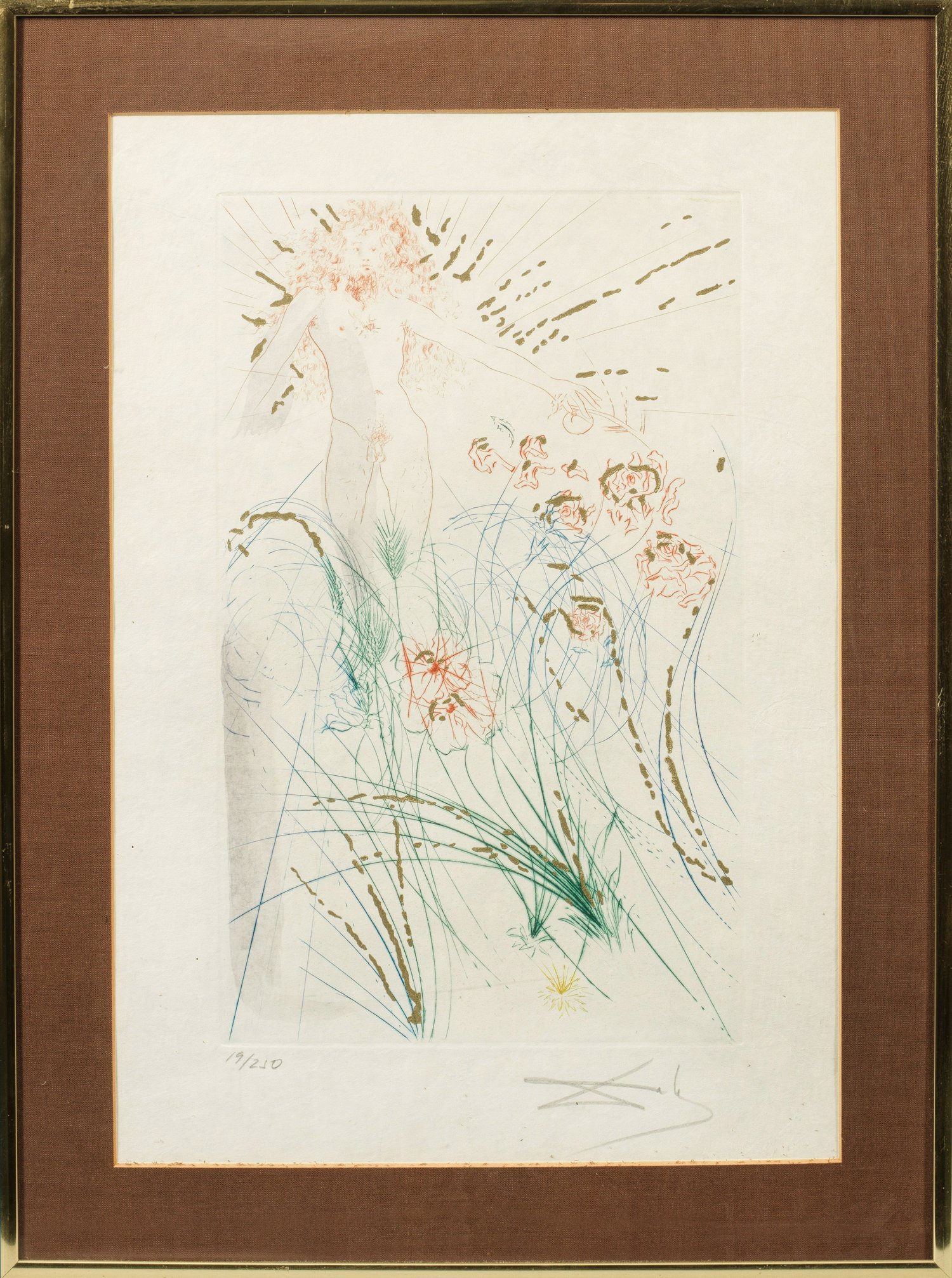 After Salvador Dalí. Etching with stencil colouring and gold on Japan paper. Inscribed and numbered 19/250. Blue stamp "Edition USA" on the reverse.