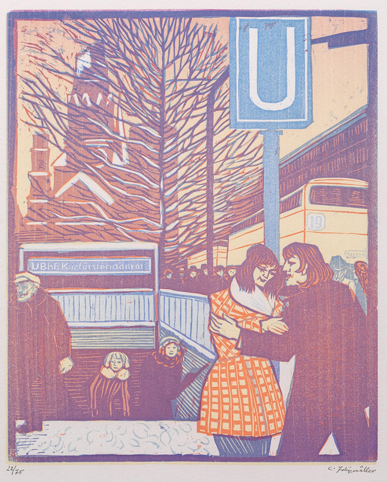 Farbholzschnitt/Velin, 1974/75. Sign u. nummeriert 58/75, im Druckstock monogr.; Gedruckt bei Reiter-Druck, Berlin. Wvz. Söhn 699b (von b). Breitrandiges, insgesamt wohlerhaltenes, prägnantes Blatt des Expressionisten mit Szene vorm U-Bahnhof Kurfürstendamm und Gedächtniskirche im Hintergrund. Darstellung ca. 30,1 x 25 cm; Blatt ca. 49 cm x 38 cm. Rahmen.