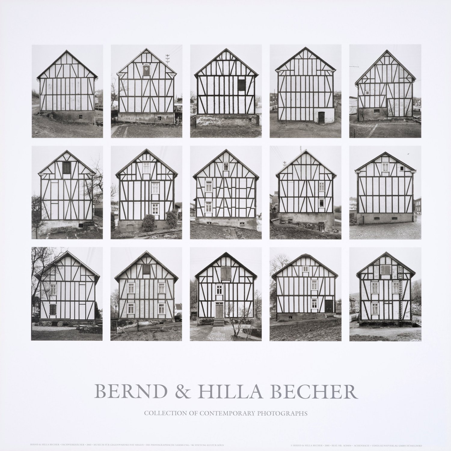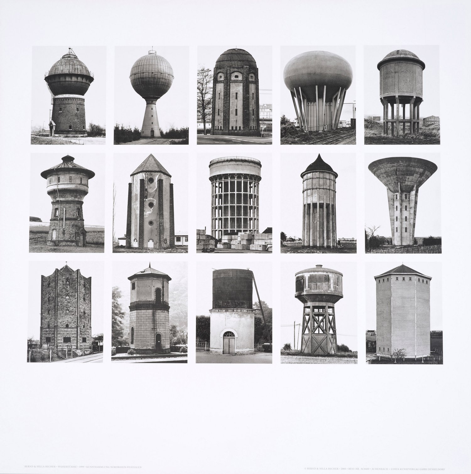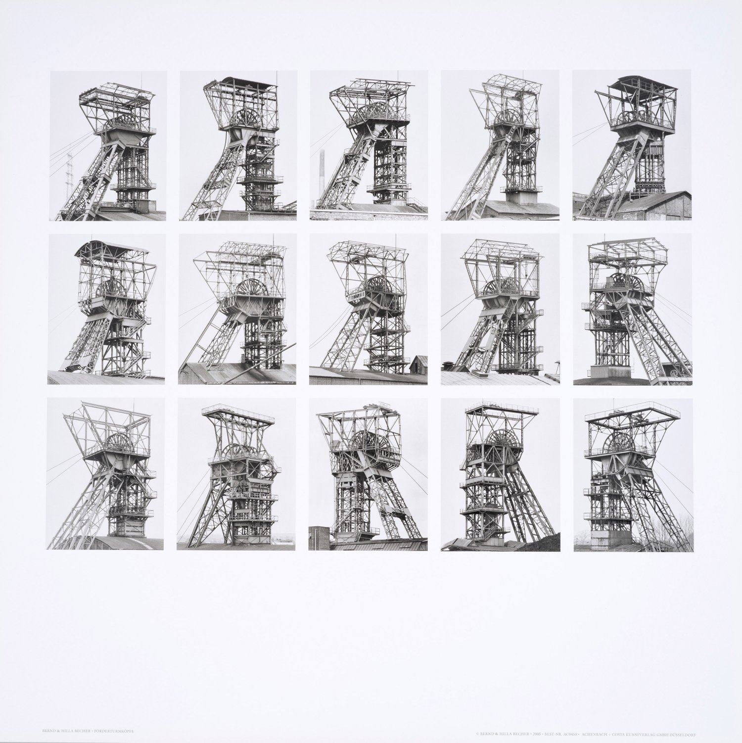 Offsetdrucke/festes, glattes Kunstdruckpapier. Unterhalb jeweils typographisch bez.; Erschienen bei Achenbach + Costa Kunstverlag AG GmbH, 2005. Nach den Fotografieserien "Wassertürme" (1999, Kunstsammlung Nordrhein-Westfalen). "Förderturmköpfe" und "Fachwerkhäuser" (2003, Museum für Gegenwartskunst Siegen). Blatt je ca. 70 cm x 70 cm.