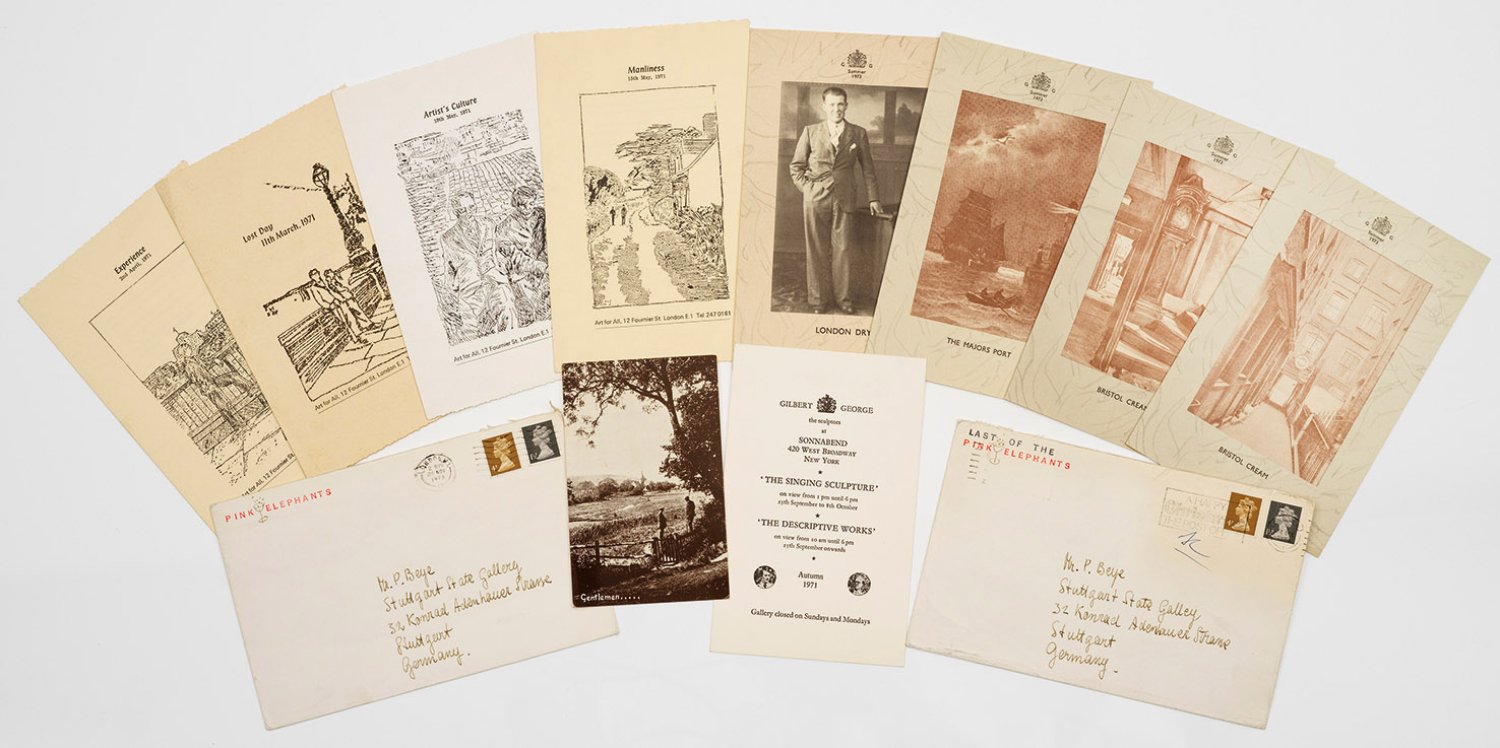 Buchdruck und Lithographie bzw. Offsetlithographie/Papier, 1971-1973. Jeweils sign. in Rot. Erschienen bei Art for All, London. Enthält vier (von acht) Karten aus der Serie "Pink Elephants" (1973) mit zwei adressierten Umschlägen; vier (von acht) Karten aus der Serie "The Eight Limericks" (1971), eine Grußkarte "Gentlemen..." (1972) sowie eine Einladungskarte für "The Singing Sculptures" und "The Descriptive Works" am 25. September - 8. Oktober 1971 im "Sonnabend" in New York. Die Grußkarten sind jeweils adressiert an Dr. Peter Beye (geb. 1932 Berlin), den damaligen (bis 1994) Direktor der Staatsgalerie in Stuttgart. Blattmaße 14,1 cm x 9 cm bis 20,3 cm x 12,7/25,4 cm.