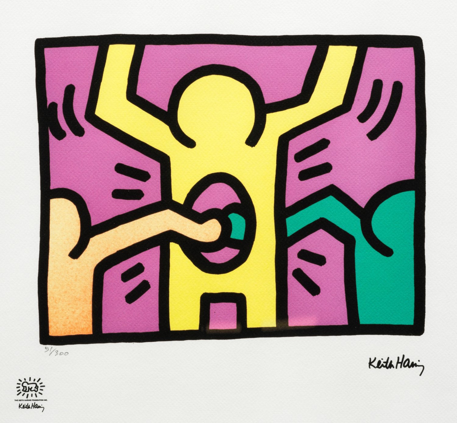 After Keith Haring (1958 - 1990). Serigraph in colours an laid paper. Signed in the stone, with blind stamp and emblem of the Keith Haring Foundation. Numbered 91/300.