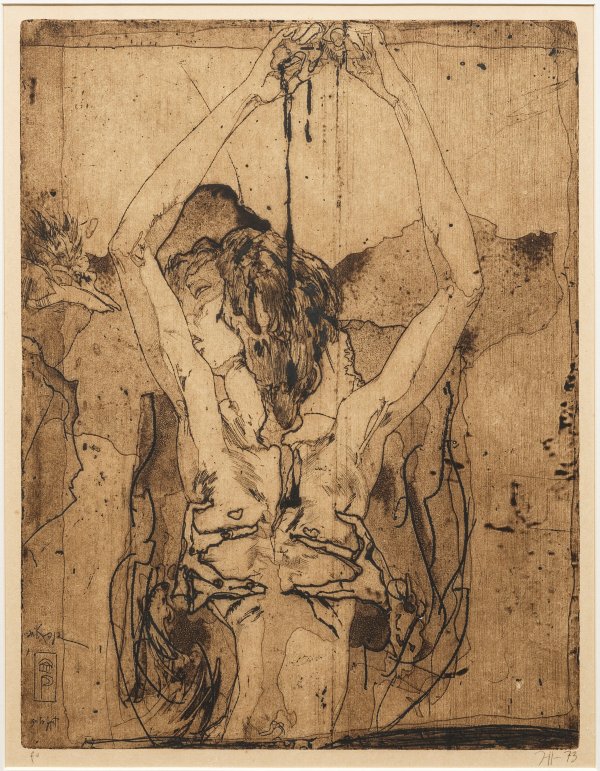Aquatint and drypoint on wove paper, 1973. Hand-signed. From the portfolio "Totentanz", printed by Atelier Volker Sammet, Stuttgart, published by Luigi Toninelli, Agno, and Cayman Graphics, George Town, 1974. One of probably 12 artist's proofs.