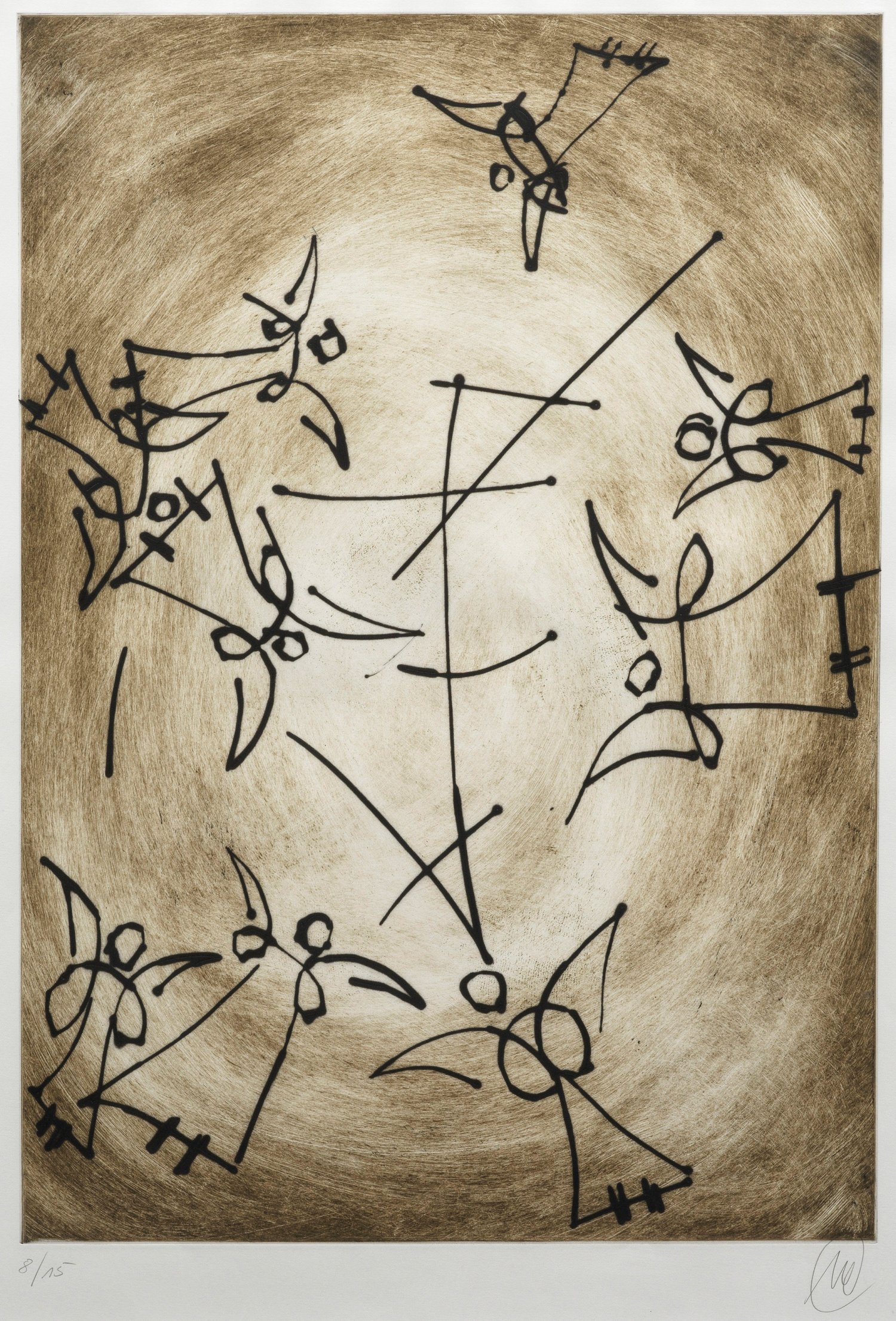 Radierung in Sepia u. Schwarz/Papier. Sign. u. nummeriert 8/15. Von Lüpertz exklusiv geschaffen für die Ausstellung "Sieben Engel für Württemberg" in der Stuttgarter Stiftskirche. Plattenmaß 69,5 cm x 49 cm. Rahmen.