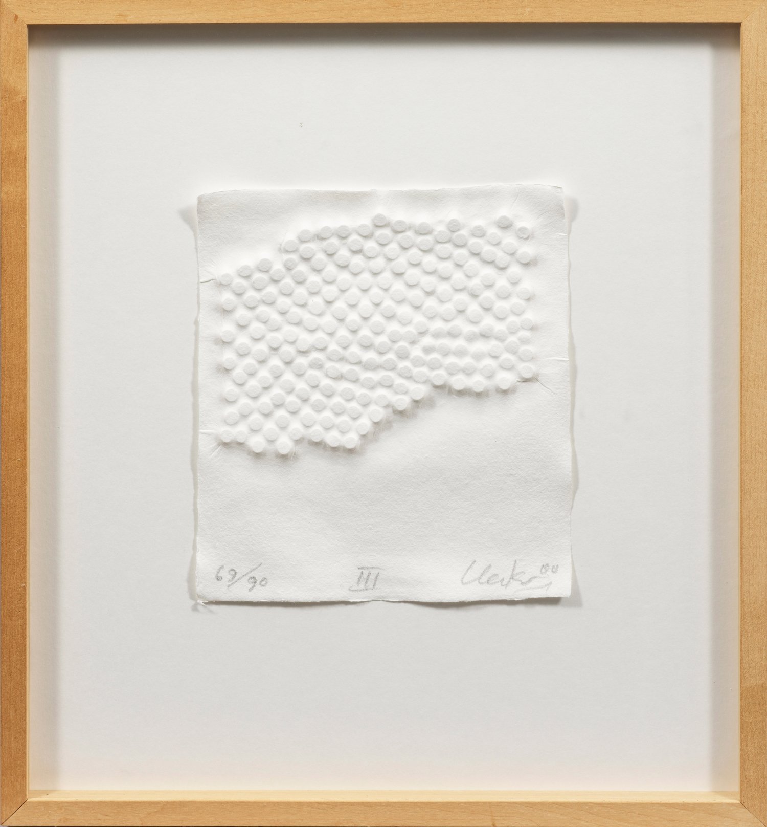 Prägedruck/handgeschöpftes Büttenpapier, 2000. Sign., dat,. (20)00, bez. "III" und nummeriert 69/90. Blatt III (von IV) aus der gleichnamigen Serie. Blatt ca. 24 cm x 21 cm. Rahmen.