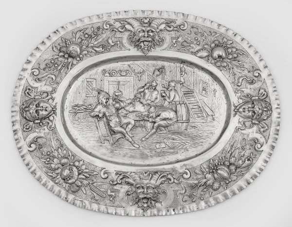 Silber. Ovale Form. Gering gemuldeter Spiegel mit ausdrucksstarker, reliefplastischer Genredarstellung einer Wirtshausszene mit fünf trinkenden, rauchenden und Karten spielenden Männern. Breite, flache Fahne mit wellenförmig gekniffenem Rand, umzogen von breitem, reliefplastisch getriebenem Band alternierend verziert mit großen Maskaronen, Festons und üppigen Fruchtbündeln über zart punziertem Grund. Gest., Pseudomarken. Gew. ca. 880 g. 50 cm x 39 cm.