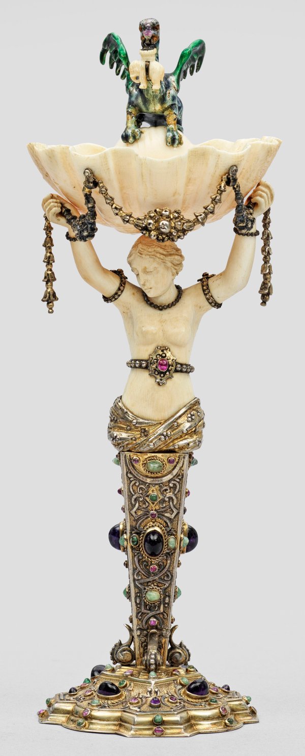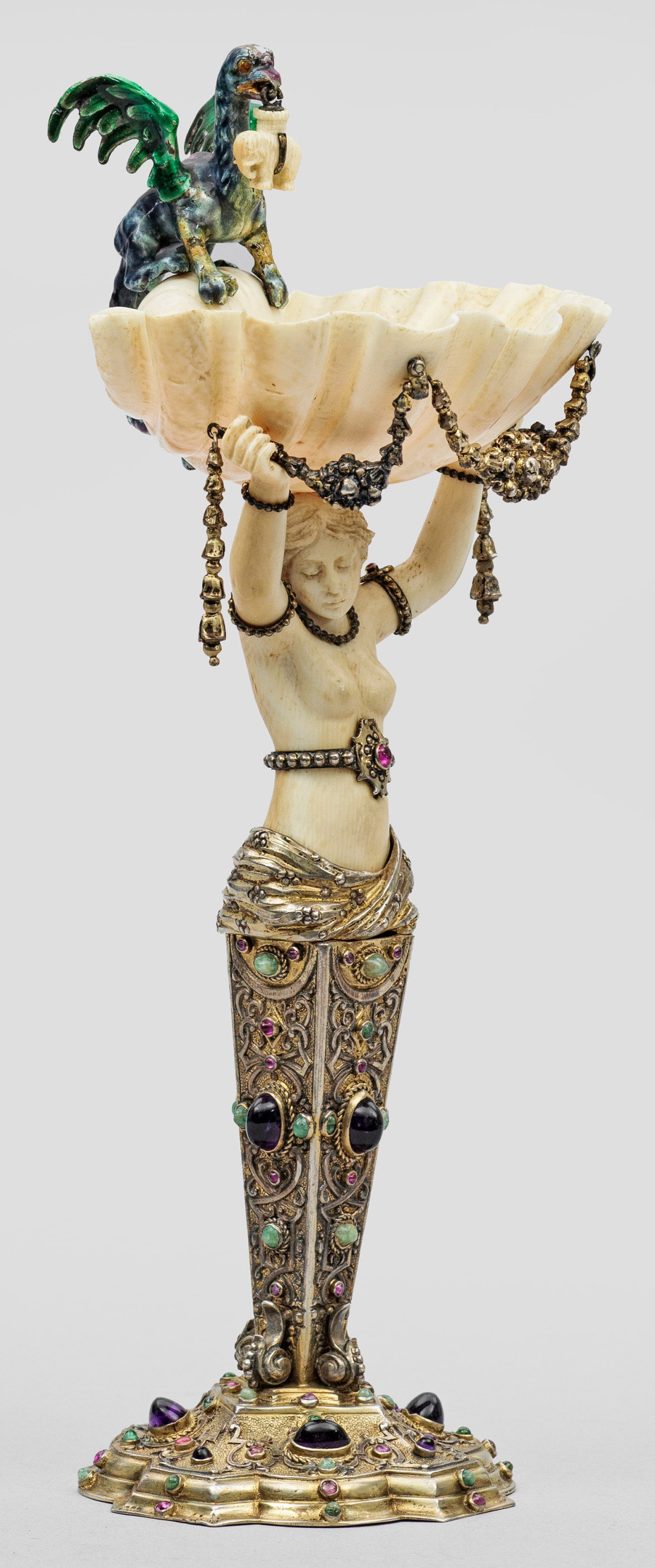Silber, vergoldet sowie teilw. emailliert, Elfenbein. Passig geschweifter, gestufter Stand, übergehend in von Voluten gerahmten, vierfach gekanteten Schaft besetzt mit feinen Schmucksteincabochons, u. a. aus Amethyst, hellgrünem Calcit und Granat. Umlaufend feiner Bandelwerkdekor über punziertem Grund. Darüber, aus einem drapierten Tuch erwachsend, der mit Ketten geschmückte Oberkörper einer Frau, auf ihren hochgestreckten Armen eine Schale in Form einer Jakobsmuschel, umzogen von beweglichen Blütenfestons, tragend. Als Abschluss auf dem Muschelrand sitzend die vollplastische Darstellung eines Drachens, akzentuiert durch polychrome Emaillemalerei. In seinem Maul an einer beweglichen Öse ein kleiner Elefant hängend. Gest., 800, Herstellerzeichen. H. 23 cm.