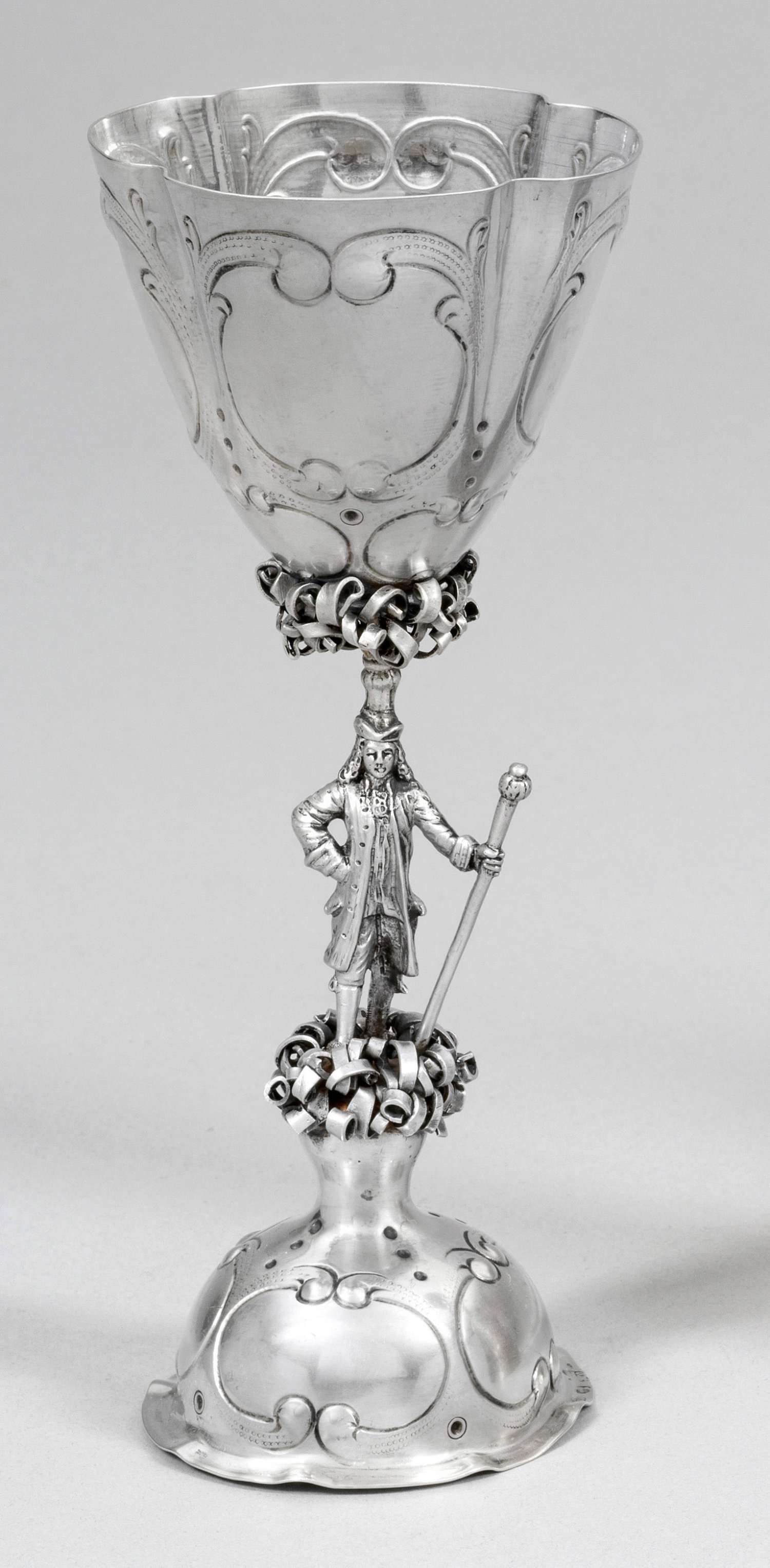 Silber. Stark aufgewölbter Stand mit ausgestelltem Standring, übergehend in schmalen Schaft in Form eines Mannes mit Gehrock und langem Gehstock in der Hand. Ober- und unterhalb verziert mit eingedrehten Silberfäden. Konisch aufschwingende Kuppa, verziert mit gegeneinandergestellten C-Schwüngen. Gest. 800, Herstellerzeichen. Gew. ca. 135 g. H. 17,5 cm.