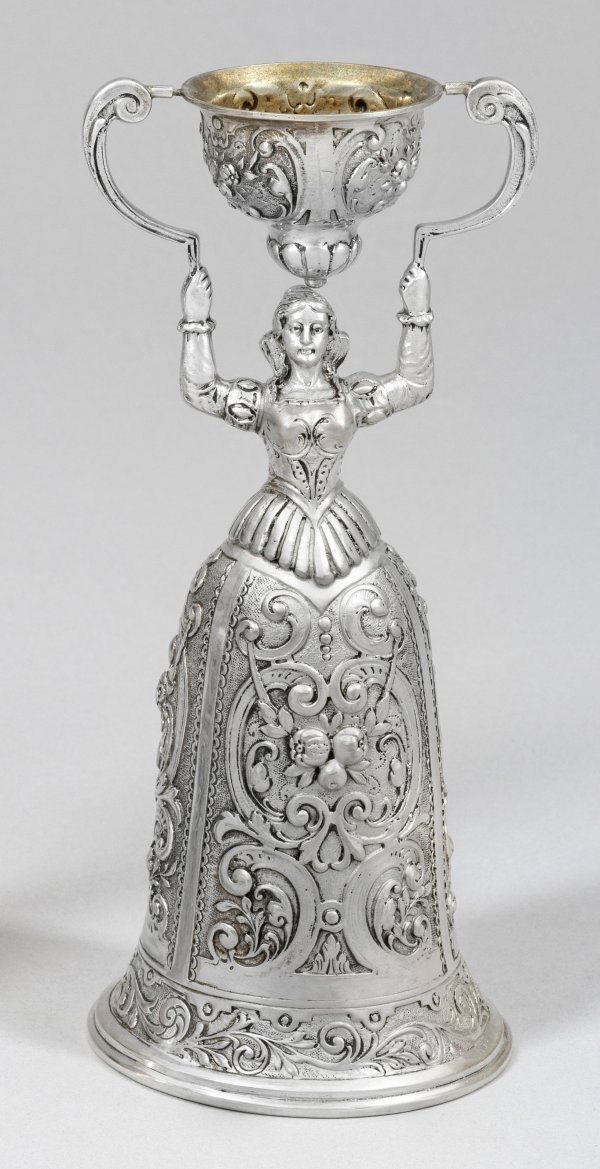 Silber. Vollplastische Darstellung einer Frauenfigur im Renaissancekleid, der glockenförmige Rock als Kuppa dienend. In den erhobenen Händen, zwischen zwei volutierten Bügeln ein beweglich eingespannter Becher. Reiche Verzierungen in Form von Voluten, C-Schwüngen, Bandelwerk und Fruchtbündeln über punziertem Grund. Innen vergoldet. Gest. 800, Herstellerzeichen. Gew. ca. 255 g. H. 19,3 cm.