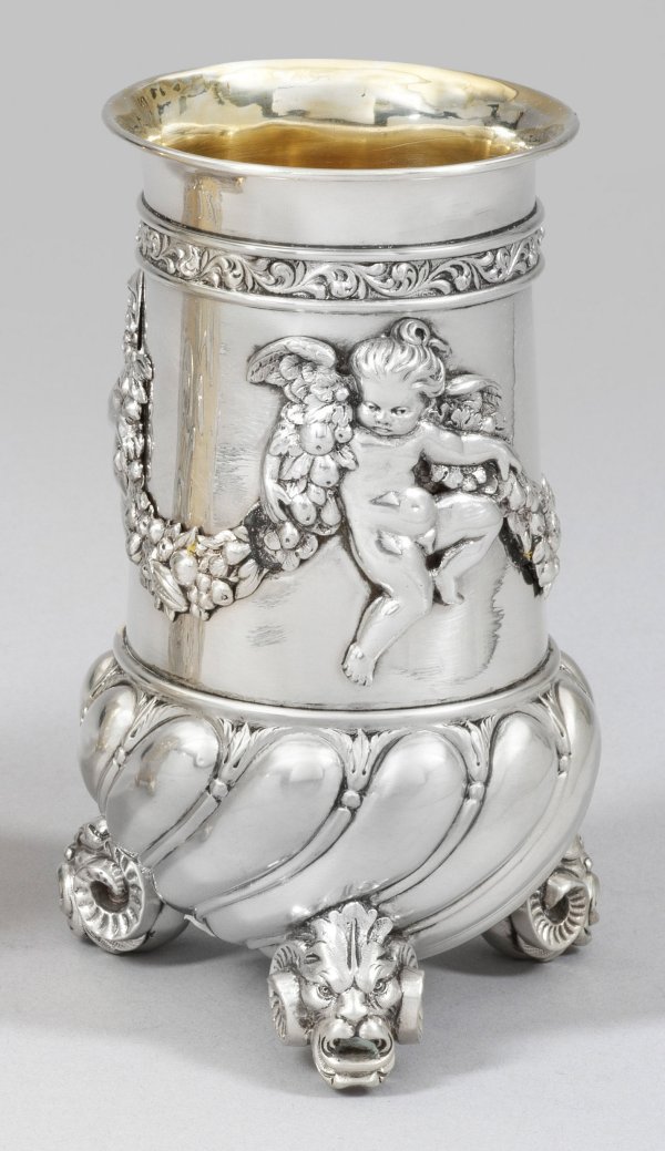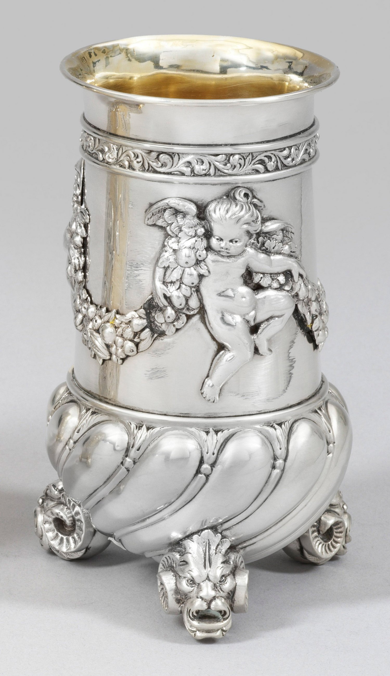 Silber. Drei Kugelfüße in Gestalt von Löwenköpfen mit Widderhörnern, übergehend in gebauchten, in der unteren Wandungshälfte von Godronen umzogenen Korpus. Konischer, glatter Halsbereich mit applizierten, reliefplastischen Putti und Früchtefestons. Unter dem ausgestellten Rand ein umlaufendes Akanthusblattfries. Innen vergoldet. Gew. ca. 375 g. H. 14,3 cm.