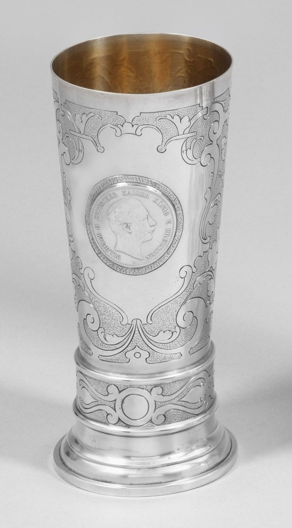Silber. Mehrfach profilierter, getreppt ansteigender Hohlstand, übergehend in konische, hohe Kuppa. Die Wandung verziert mit C-Schwüngen, stilisierten Früchtebuketts und Blattwerk über punziertem Grund. Schauseitig eingelassene 5-Mark-Münze, mit Kaiser Wilhelm II. von Preußen von 1902. Innen vergoldet. Gest. 800, Herstellerzeichen. Gew. ca. 370 g. H. 18 cm.