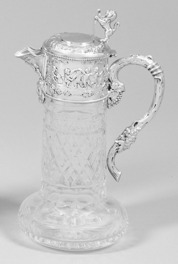 Silber aus farblosem Glas mit facettiertem Schnittdekor. Gedrückter Korpus mit hohem, zylindrischem Hals. Reliefplastische Montierung mit scharniertem Deckel und flächendeckendem Dekor aus spielenden Putti und Weinranken. Kurzer Ausguss, unterhalb mit Maskaron verziert. Bekrönende Daumenrast mit stehendem Löwen und Wappenschild. Ohrenförmiger Henkel in Gestalt eines Astes mit Weinreben. Gest. 925. H. 29 cm.