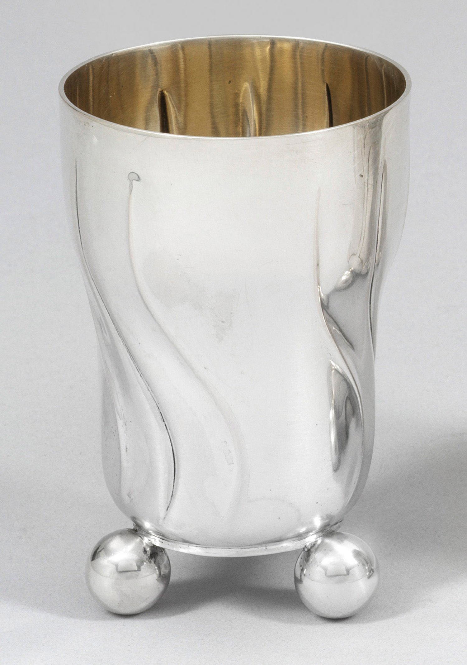 Silber. Von drei ausgestellten Kugelfüßen getragener Korpus mit glatter Wandung, umzogen von wellenförmig geschweiften, vertikalen Zügen. Innen vergoldet. Gest. 800, Herstellerzeichen. Gew. ca. 130 g. H. 10,5 cm.