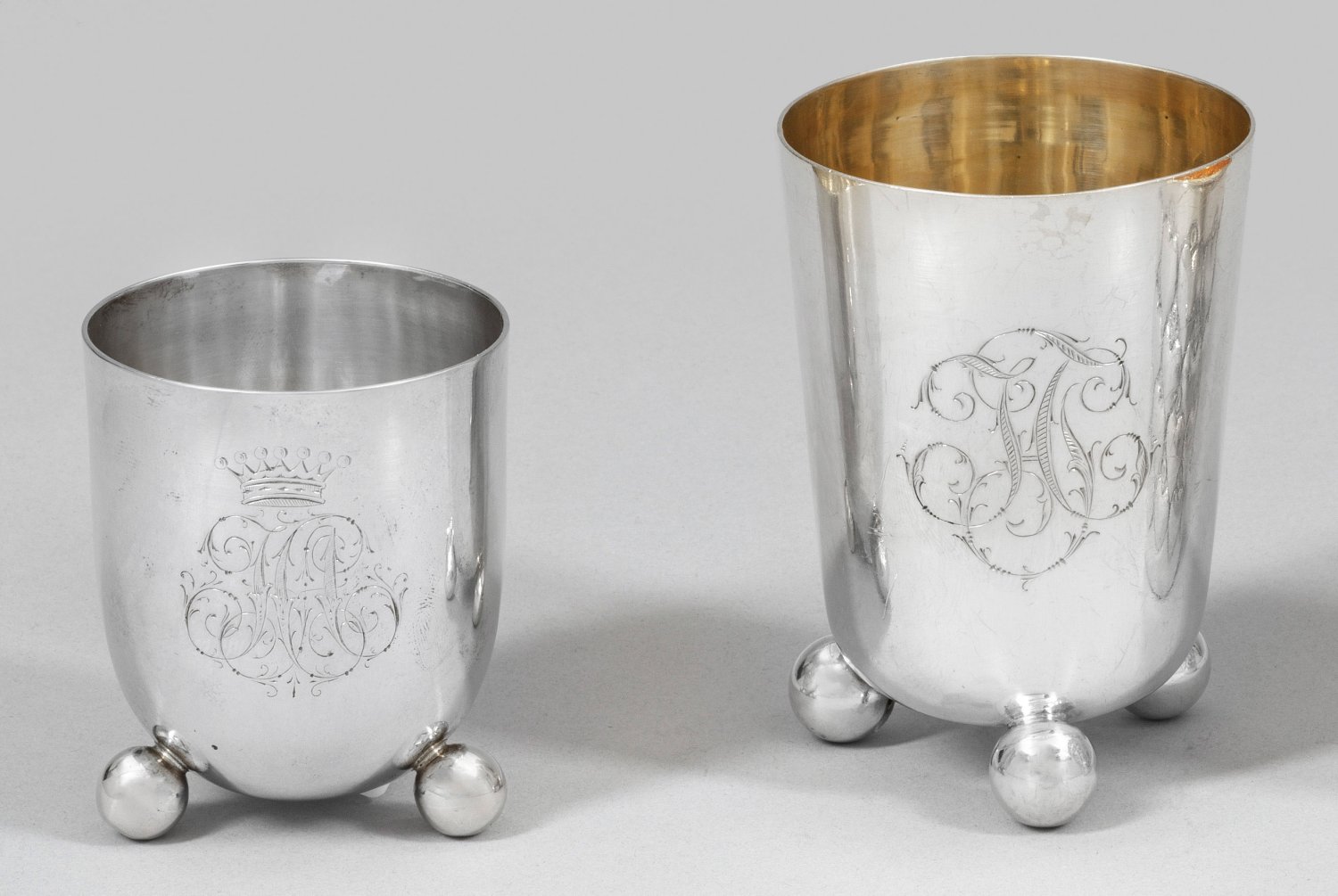 Silber. Gering konischer, von drei ausgestellten Kugelfüßen getragener Korpus mit glatter Wandung. Schauseitig stark ligiertes, graviertes Monogramm, teilw. unter Freiherrenkrone sowie innen vergoldet. Gest. 800, teilw. undeutl. Herstellerzeichen. Gew. zus. ca. 200 g. H. 7,5 cm - 10 cm.