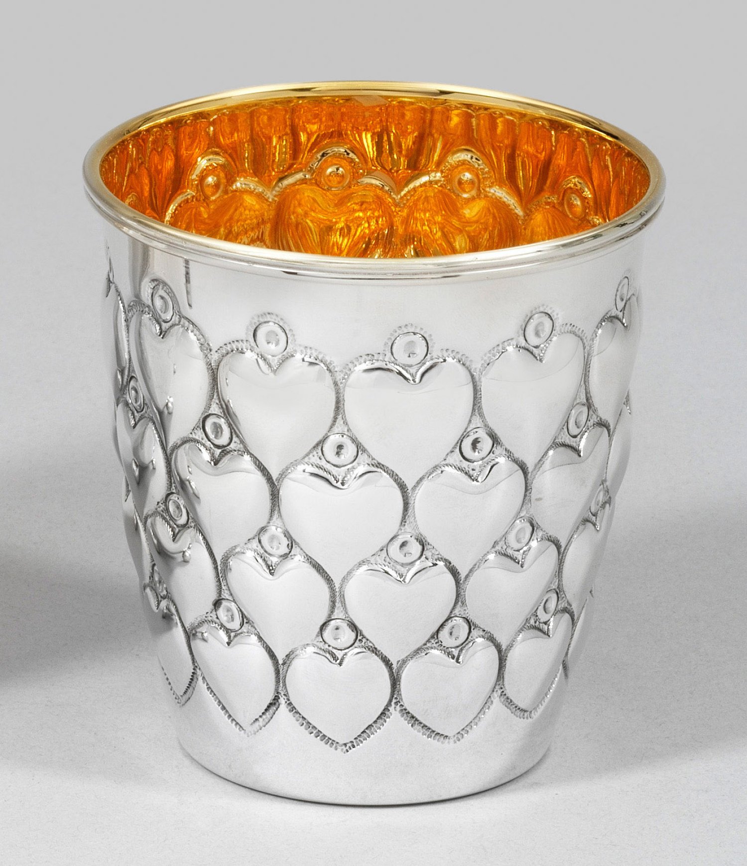 Sterlingsilber. Gering konisch mit glattem Lippenrand. Wandung vierreihig versetzt umzogen von reliefplastischen Herzen. Innen vergoldet. Gest. 925. Gew. ca. 105 g. H. 8 cm.