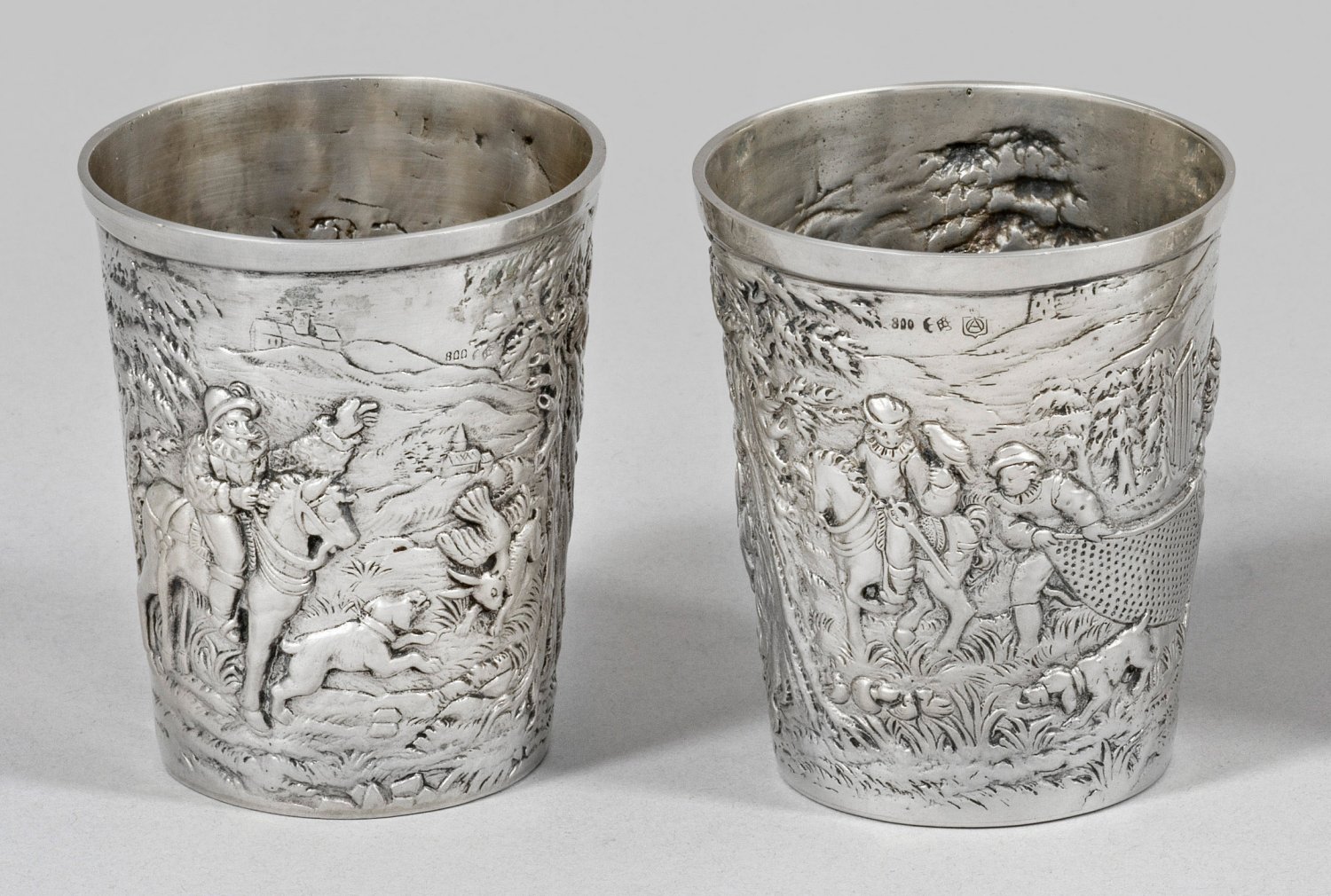 A pair of small heavy German silver hunting beakers. Standard mark 800, maker´s mark.
