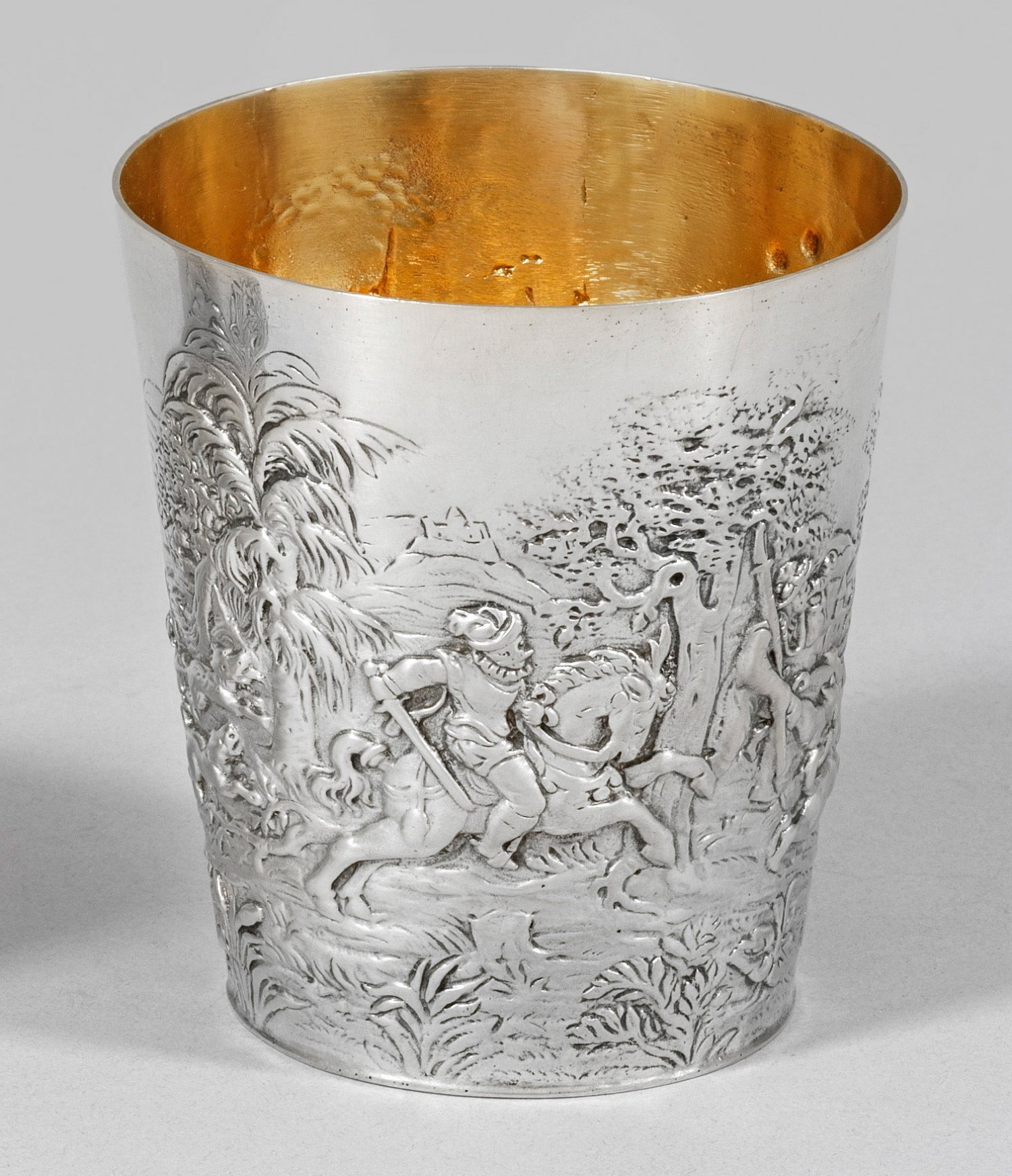 Silber. Über flachem Stand konischer Korpus. Die glatte Wandung in der unteren Hälfte umzogen von reliefplastischer Darstellung einer Hirschhatz vor bewaldeter Landschaft. Innen vergoldet. Gest. 835, Herstellerzeichen. Gew. ca. 215 g. H. 8,9 cm.