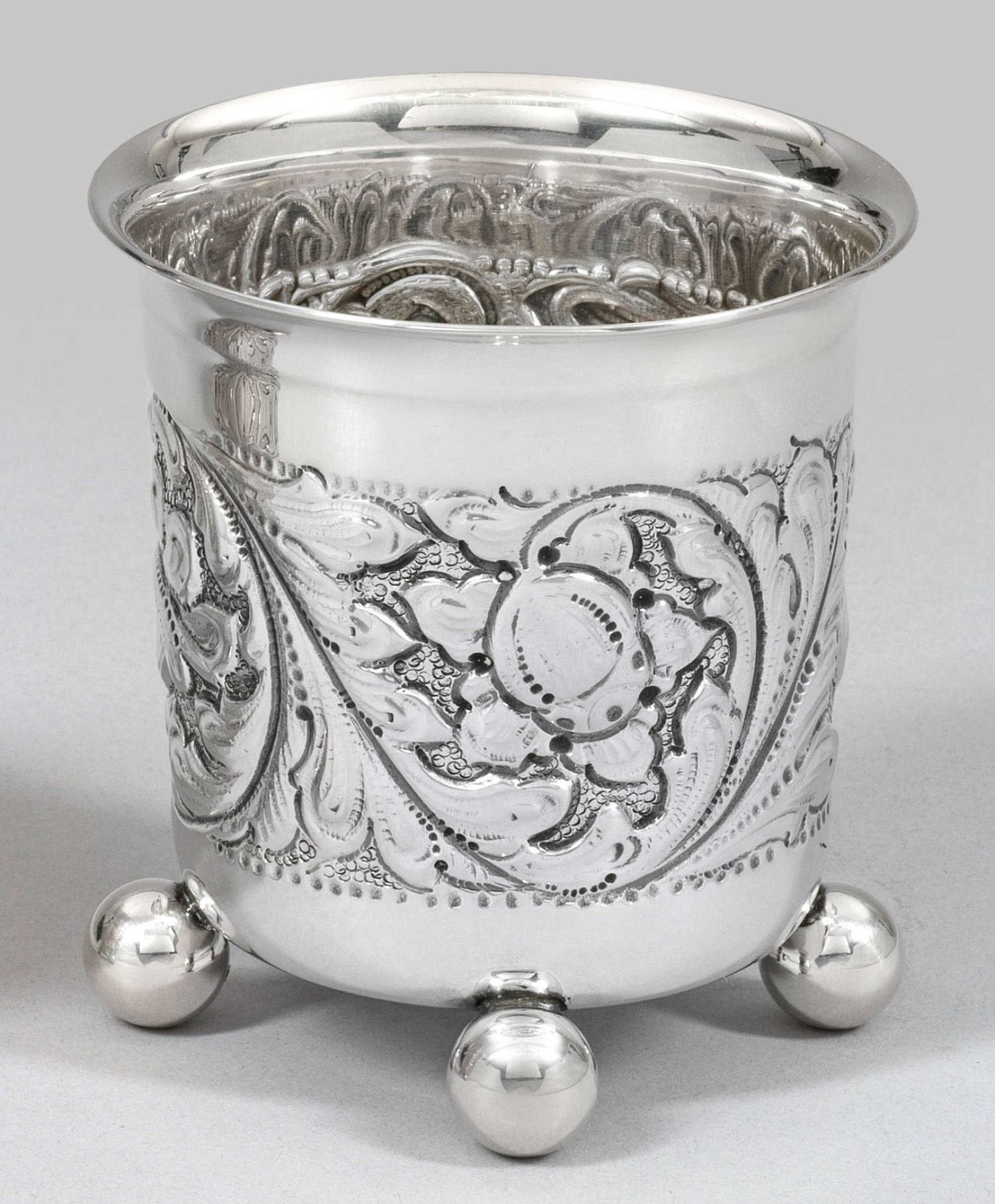 Silber. Über drei ausgestellten Kugelfüßen gering konischer Korpus, übergehend in glatten, ausschwingenden Randbereich. Die Wandung mittig umzogen von reliefplastischem Band aus großen Barockblumen und Akanthusblättern. Gest. 830, Herstellerzeichen. Gew. ca. 150 g. H. 8,5 cm.