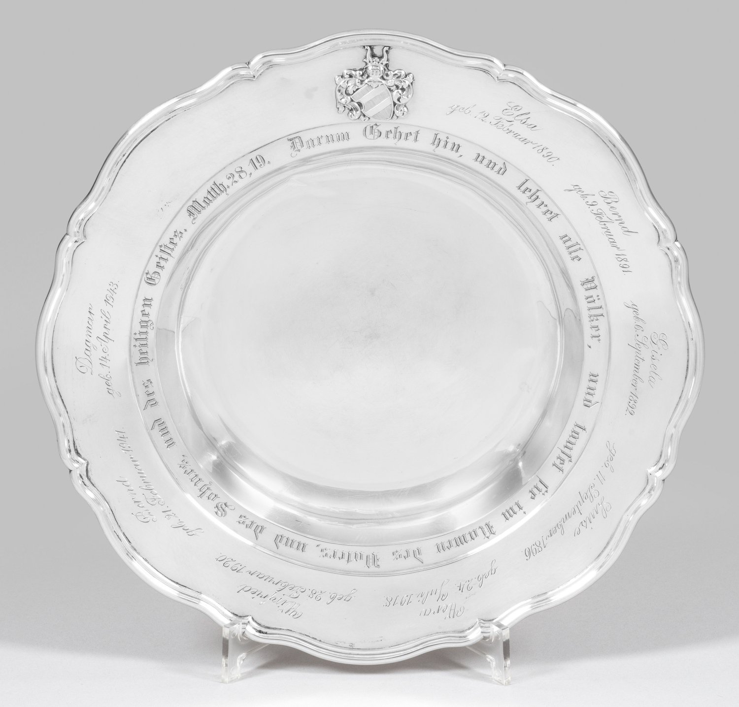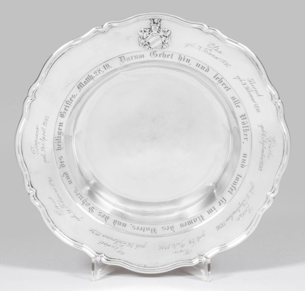 Silber. Gemuldeter Spiegel, übergehend in breite Fahne und profilierten, blütenförmig geschweiften Rand. Unterseitig mit Widmung "Zur Taufe des ersten Kindes meines Sohnes Hans. Gott erhalte, schütze und segne ihn und sein Geschlecht. 29. März 1890. von Arnim.". Schauseitig die reliefplastische Darstellung des arnimschen Wappens über graviertem Taufspruch sowie die Namen und Geburtsdaten von acht Nachkommen von Hans von Arnim aus den Jahren 1890 bis 1943. Minim. best.; Gest. 800, Juweliersmarke von Paul Telge, Berlin. Gew. ca. 685 g. D. 32 cm.