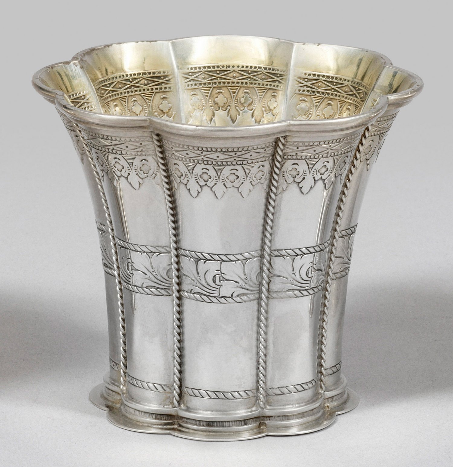 Sterlingsilber. Achtpassig geschweifter, konisch ausschwingender Korpus mit profiliertem Lippenrand. Durch drei von Kordelbändern gerahmte Zierfriese gegliederte Wandung. Innen vergoldet. Gest. Sterling, Herstellerzeichen. Gew. ca. 230 g. H. 9,5 cm.